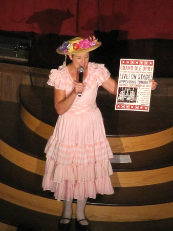 We gaan dus onbevangen op pad vanavond. Bij de Opry halen we wat te eten en te drinken en dan zoeken we onze plaatsen op. Natuurlijk gaan we eerst verkeerd zitten, maar daar komen we snel achter. Op het podium staat al een dame in oubollige kledij het publiek warm te draaien, maar ik kan er maar weinig van verstaan, omdat ze een enorm accent heeft.