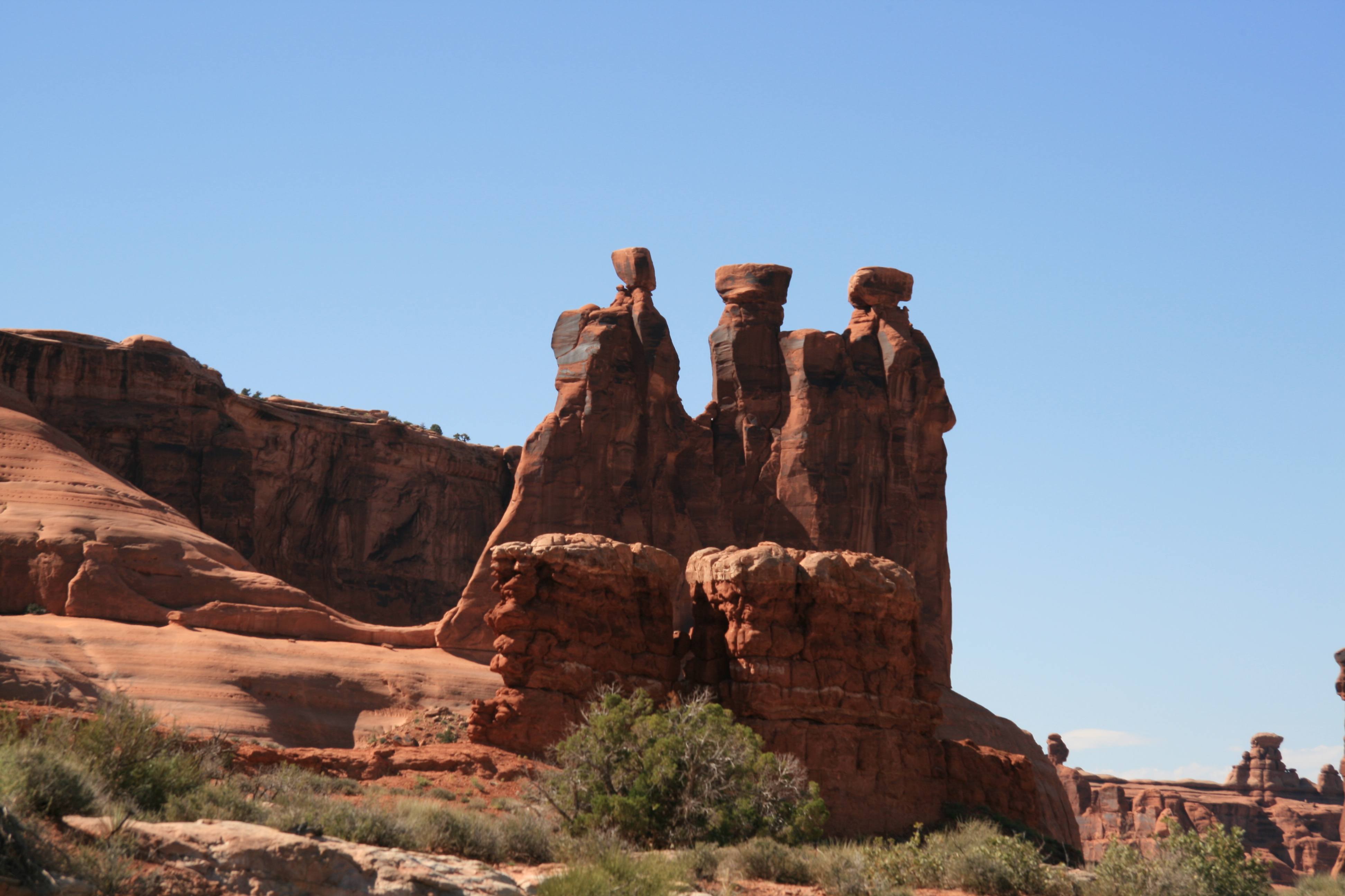 We gaan op weg naar de picknickplaatsen van Devil’s Garden om wat te eten. Als we daaraan komen, zien we dat alle tafels leeg zijn, dus we hebben de keus. We kiezen een van de tafels dicht bij de parkeerplaatsen en in de schaduw. We nemen alle spullen mee en confisqueren de tafel. Lekker rustig! Nog geen 2 tellen zitten we of er komt een chinees onze richting uit lopen. Niets mis mee, maar alsof de tafel die zo ongeveer bovenop die van ons staat de enige tafel is die vrij is, kiest hij precies diegene uit!