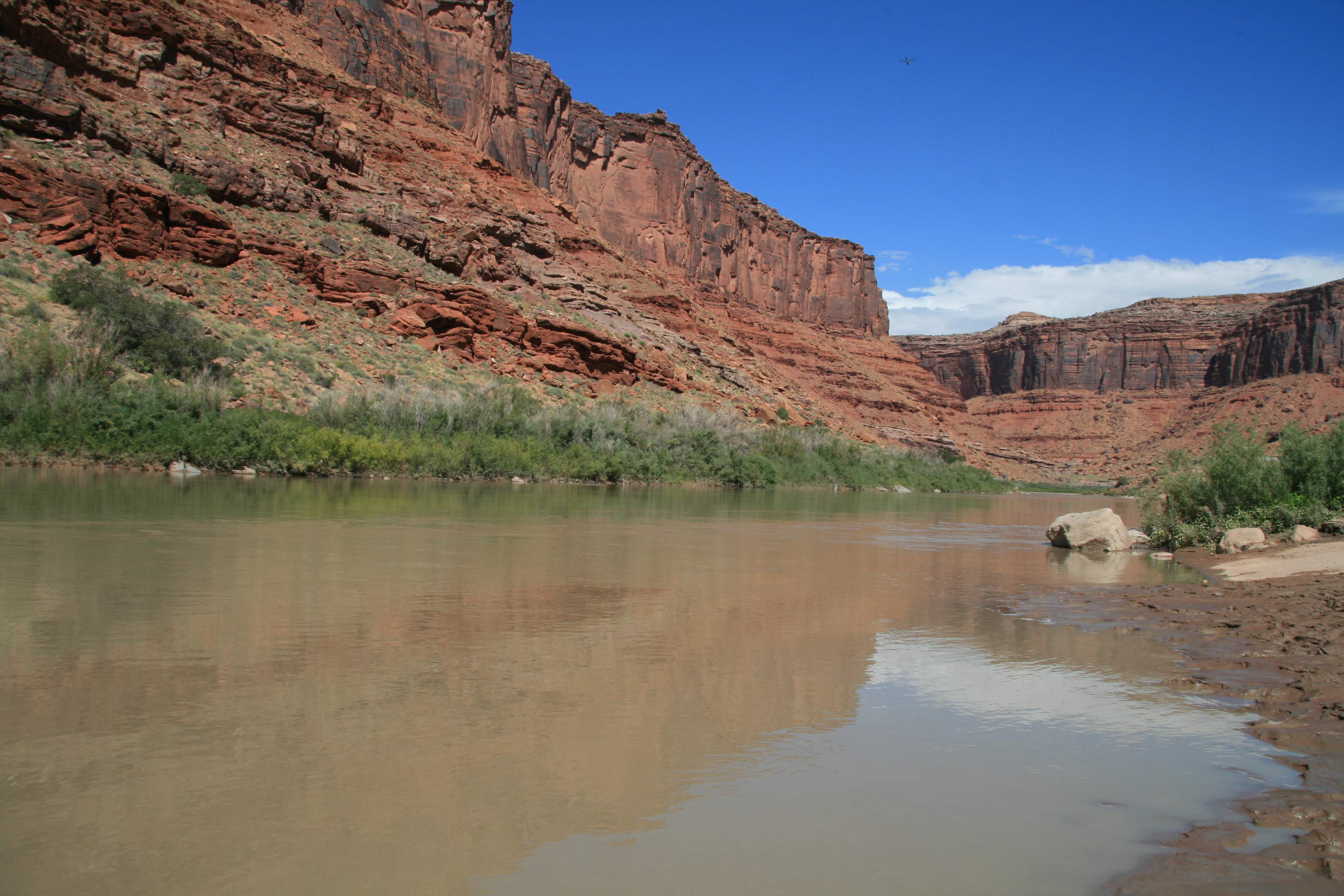 We internetten wat, gooien wat blogs en foto’s online en gaan daarna op pad. Monique wil graag de La Sal Mountain Loop nog een keer rijden. Dat vind ik ook een goed idee, het is inmiddels deels al jaren geleden dat we die hebben gereden. We rijden naar het noorden van het stadje en gaan daar de Scenic Byway 128 op. We rijden hier langs de Colorado River en ik ben op zoek naar een plekje waar we kunnen pootje baden. Zwemmen zal veel te koud zijn!