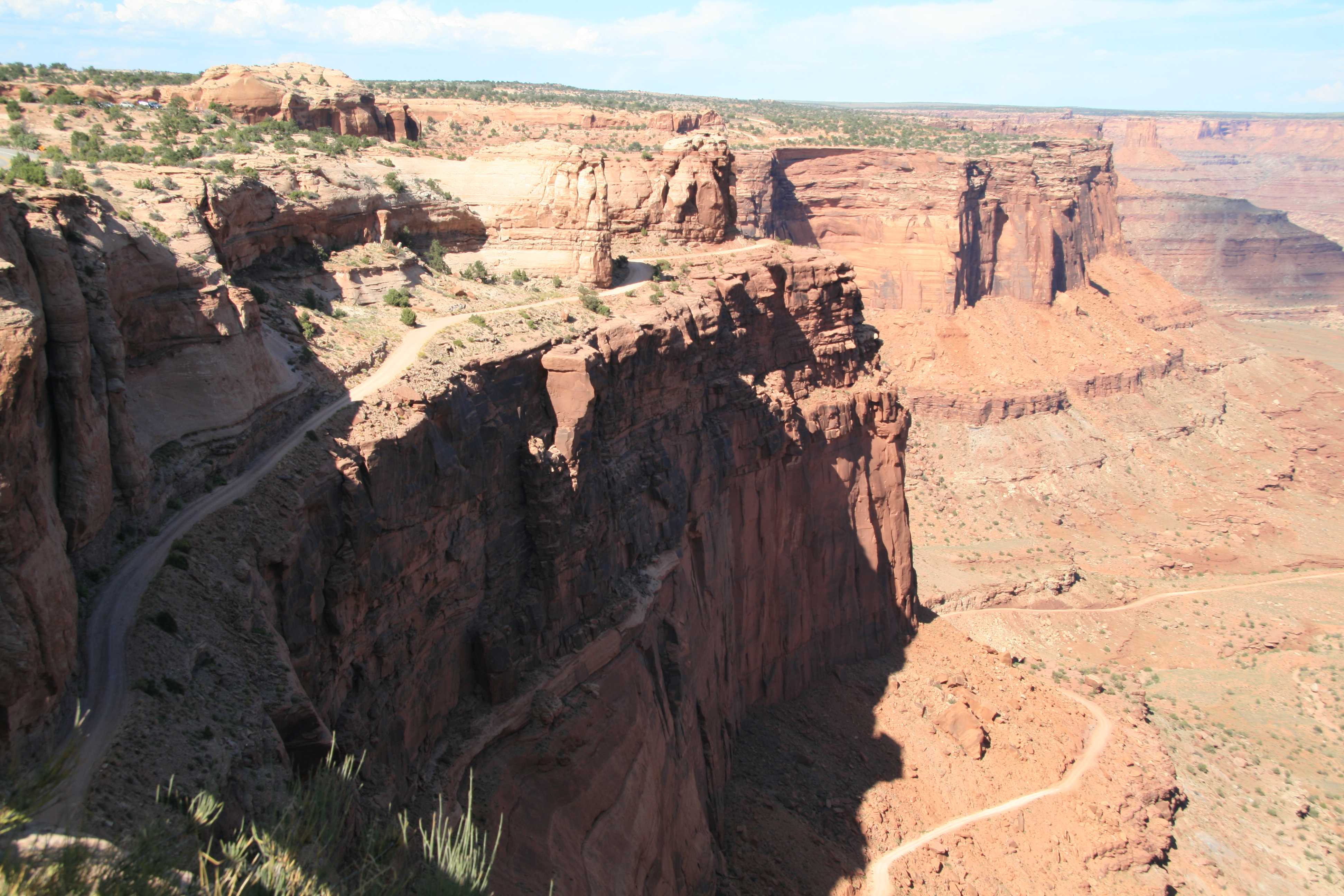Ik wil graag nog even naar Canyonlands National Park. Twee keer hebben we de Shafer Trail gereden, maar het blijft trekken. Ik moet een blik werpen op de trail. We rijden naar het park en laten bij de entree de pas zien. We krijgen een kaart en het krantje en rijden meteen door naar het uitkijkpunt. Eerst zien we helemaal geen jeeps op de trail, maar dan zien we ver beneden ons een auto aan komen. Ik wil wel wachten tot die naar boven komt. De trail ziet er van bovenaf goed uit, maar we zie wel diepe geulen, waar je met een te lage auto op vast zou lopen.