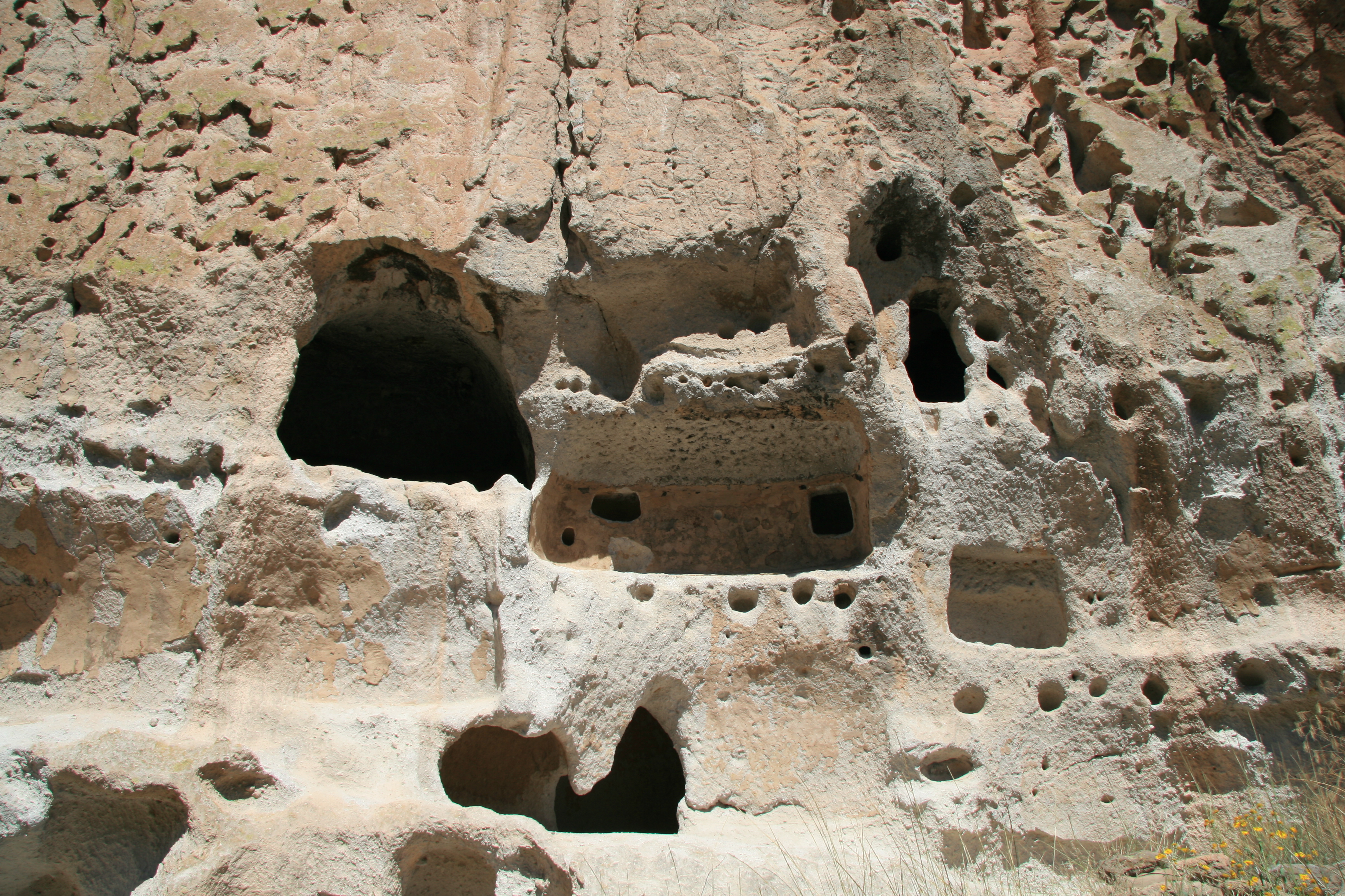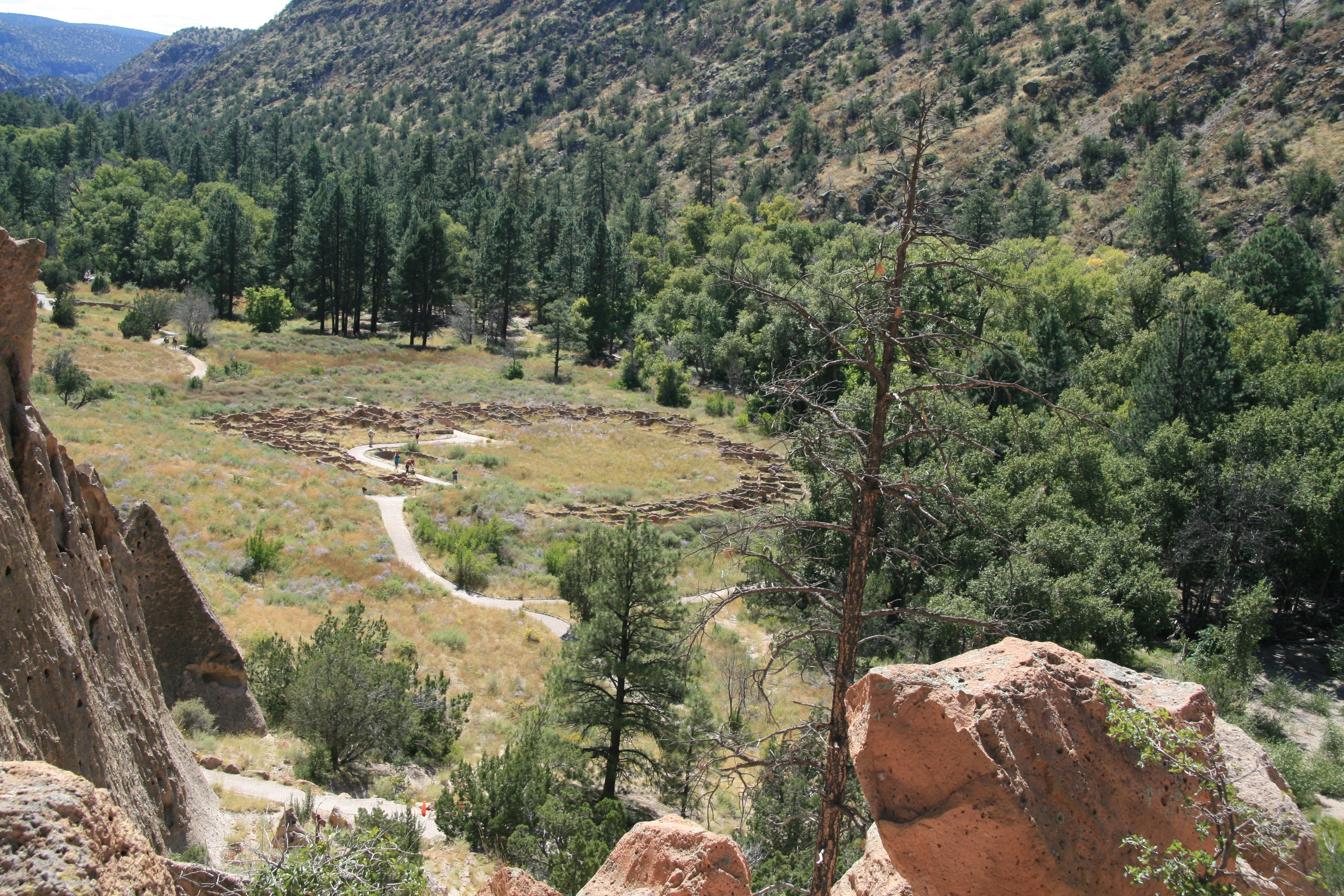 Eindelijk zijn we beneden en lopen eerst naar het visitor center. Daar laat ik mijn pas weer zien en we kopen een trailmap voor een dollar. Dan beginnen we aan de trail. We zien ook hier weer opgegraven ruimtes waar vroeger pueblo’s hebben gestaan. Maar dat is niet alles. We zien ook de grotten waar mensen geleefd hebben. Hetis ooit een gemeenschap geweest van ongeveer 400 ruimtes voor 100 bewoners. In de grotten had iedere familie ruimtes voor opslag, slaapruimtes en natuurlijk de kiva. We kunnen via ladders in de grotten kijken, maar het is te donker om foto’s te nemen.