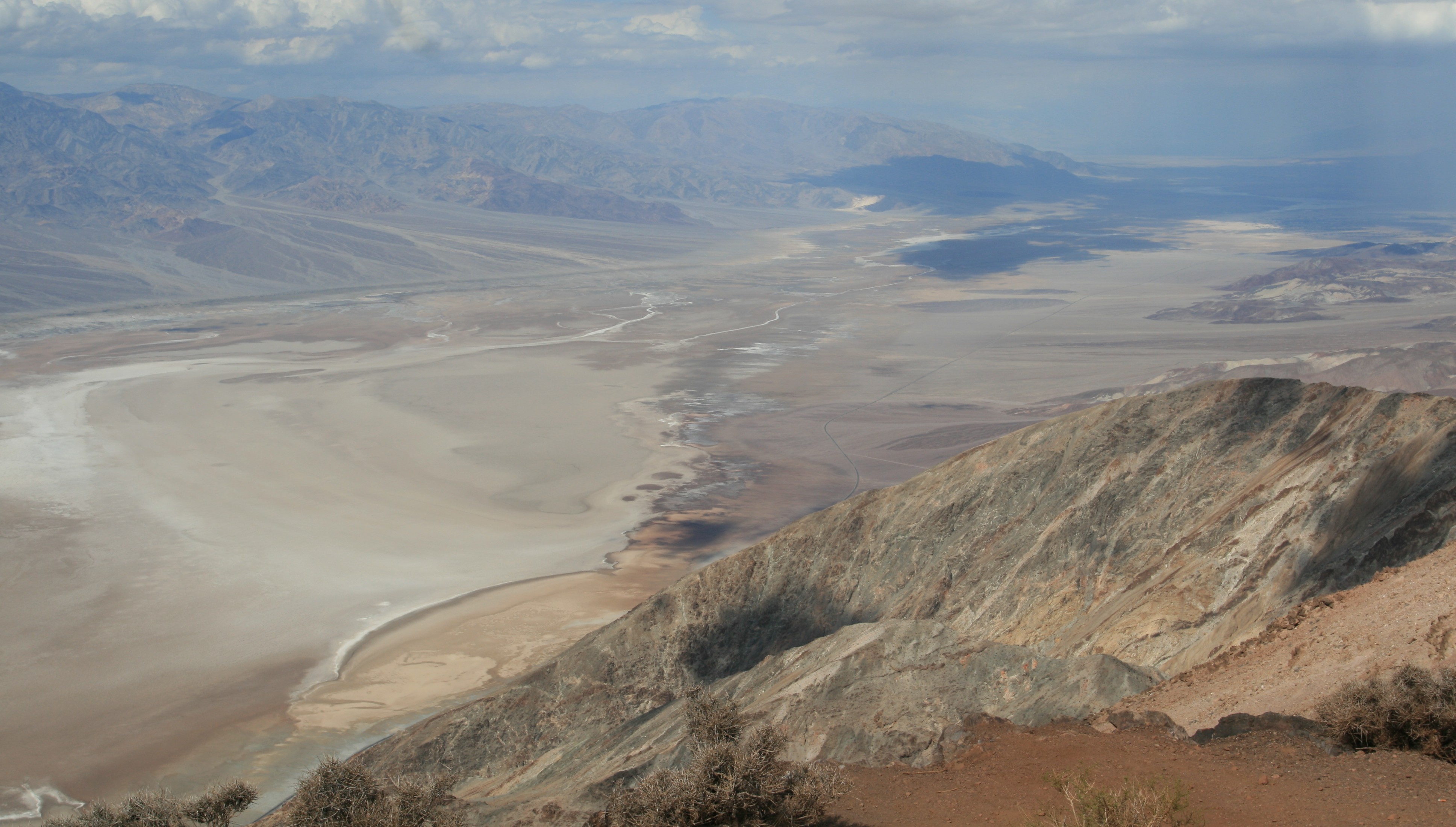 Gelukkig zijn er genoeg andere dingen te doen, maar veel hebben we al gezien. Alles wat verder interessant is voor ons ligt aan, je raadt het al, onverharde wegen. We besluiten dan toch maar naar wat oude bekenden te gaan en rijden naar Dante’s View. Hier heb je een fantastisch uitzicht op de zoutvlakte die onder zeeniveau ligt. We lopen een stuk naar boven voor een nog beter uitzicht en weer terug op deparkeerplaats, willen we de andere kant op. Maar dan begint het te onweren en we duiken snel de auto in.