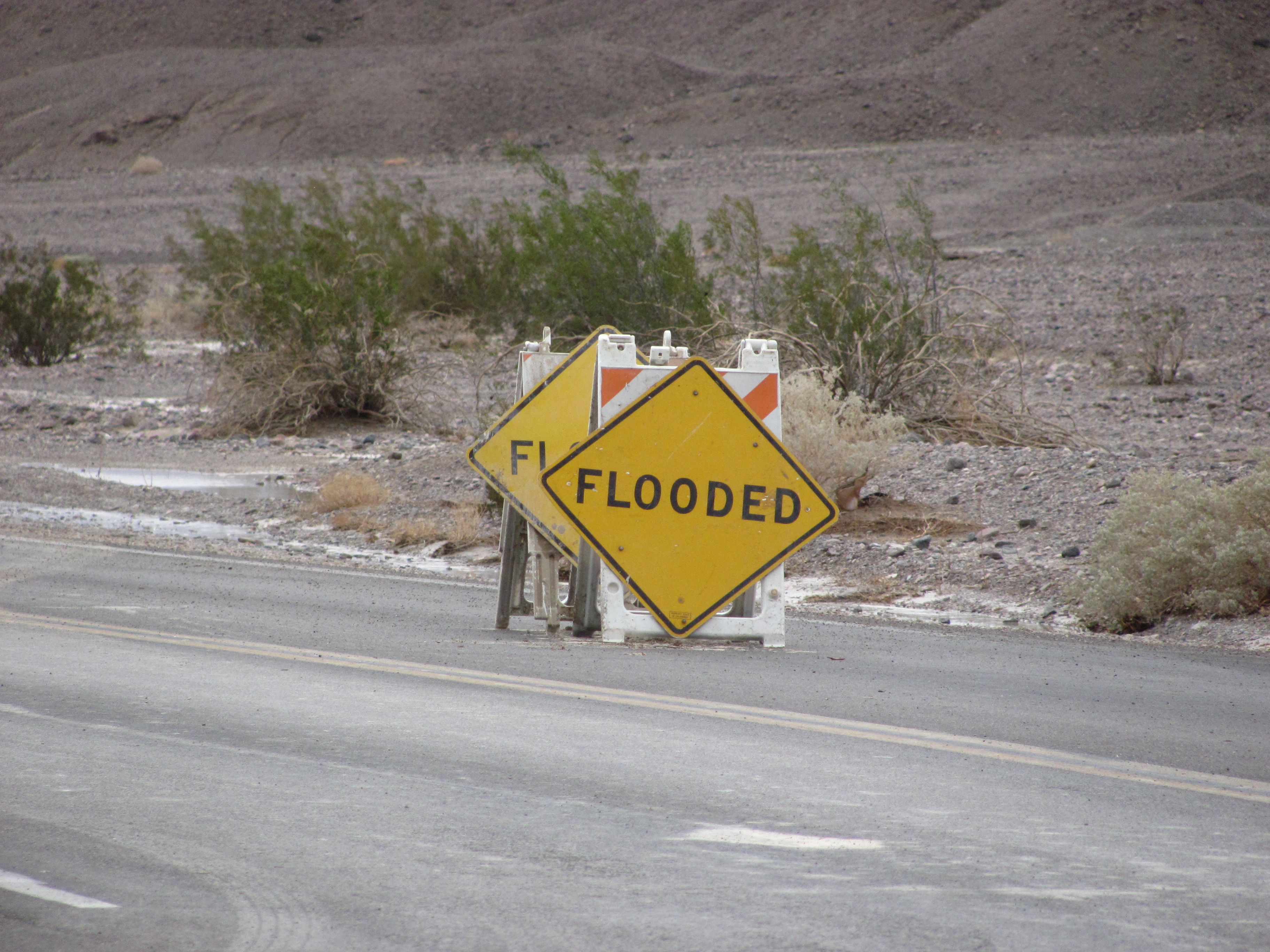 We zien een truck aankomen die het zand van de weg schraapt. Een zandschuiver, roept Monique. Maar des te dichter we bij Furnace Creek komen, des te erger wordt het. We zien dat hele stukken grond de weg op zijn geschoven met het water en als we bij het Visitor Center zijn, zien we zwaailichten en staat een hele horde mensen te kijken. Voor ons staat een camper, dus we zien niets en als ik uit stap zie ik nog niet veel. We vermoeden dat het onvoorspelbare weer is uitgemond in een gigantische wolkbreuk. Monique stapt uit en gaat kijken wat er aan de hand is.