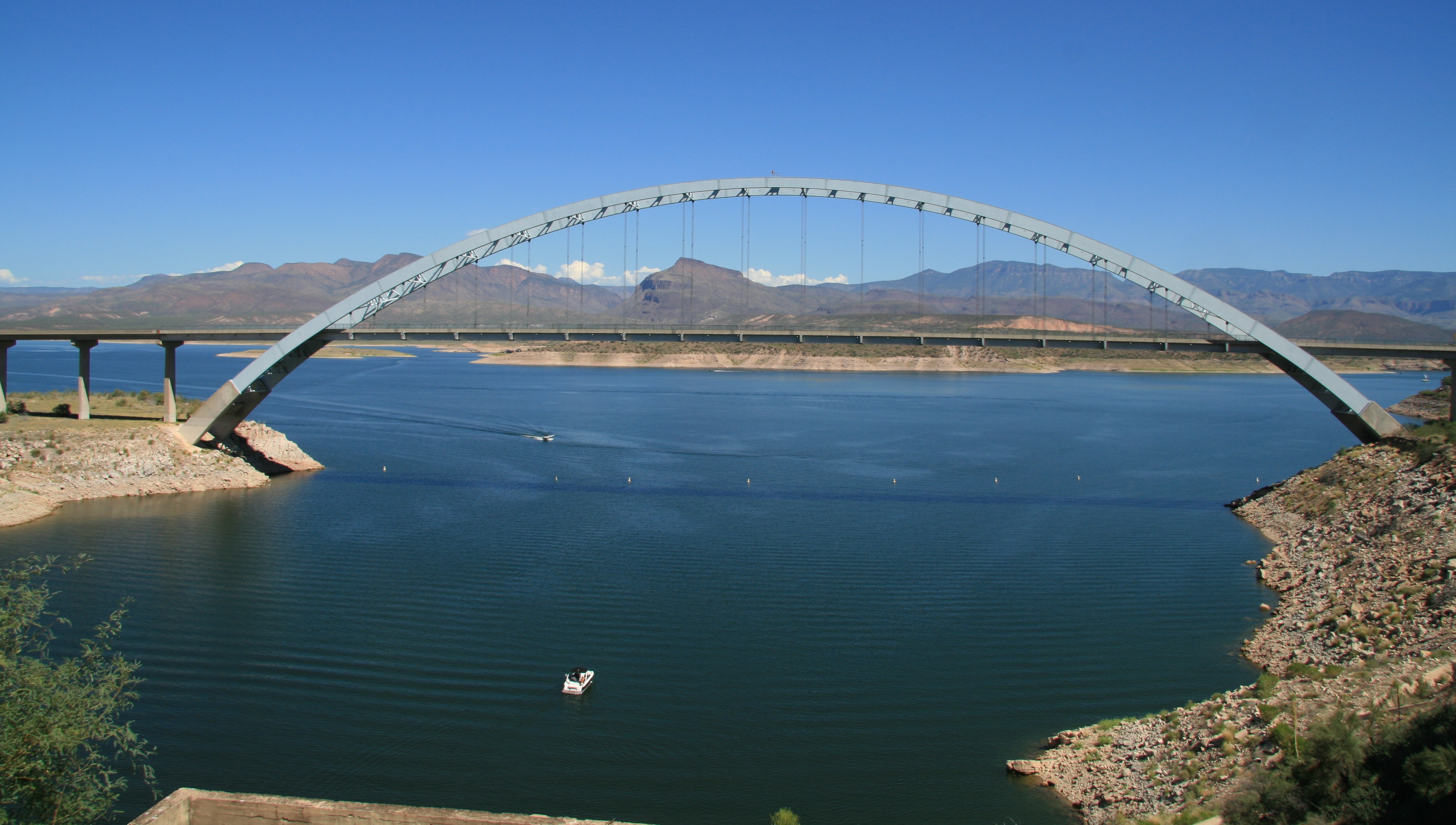 Eindelijk verschijnt het bord Apache Trail en we rijden ‘m op. We stoppen bij de Roosevelt brug en nemen een kijkje bij het meer waar allerlei bootjes lekker aan het varen zijn.