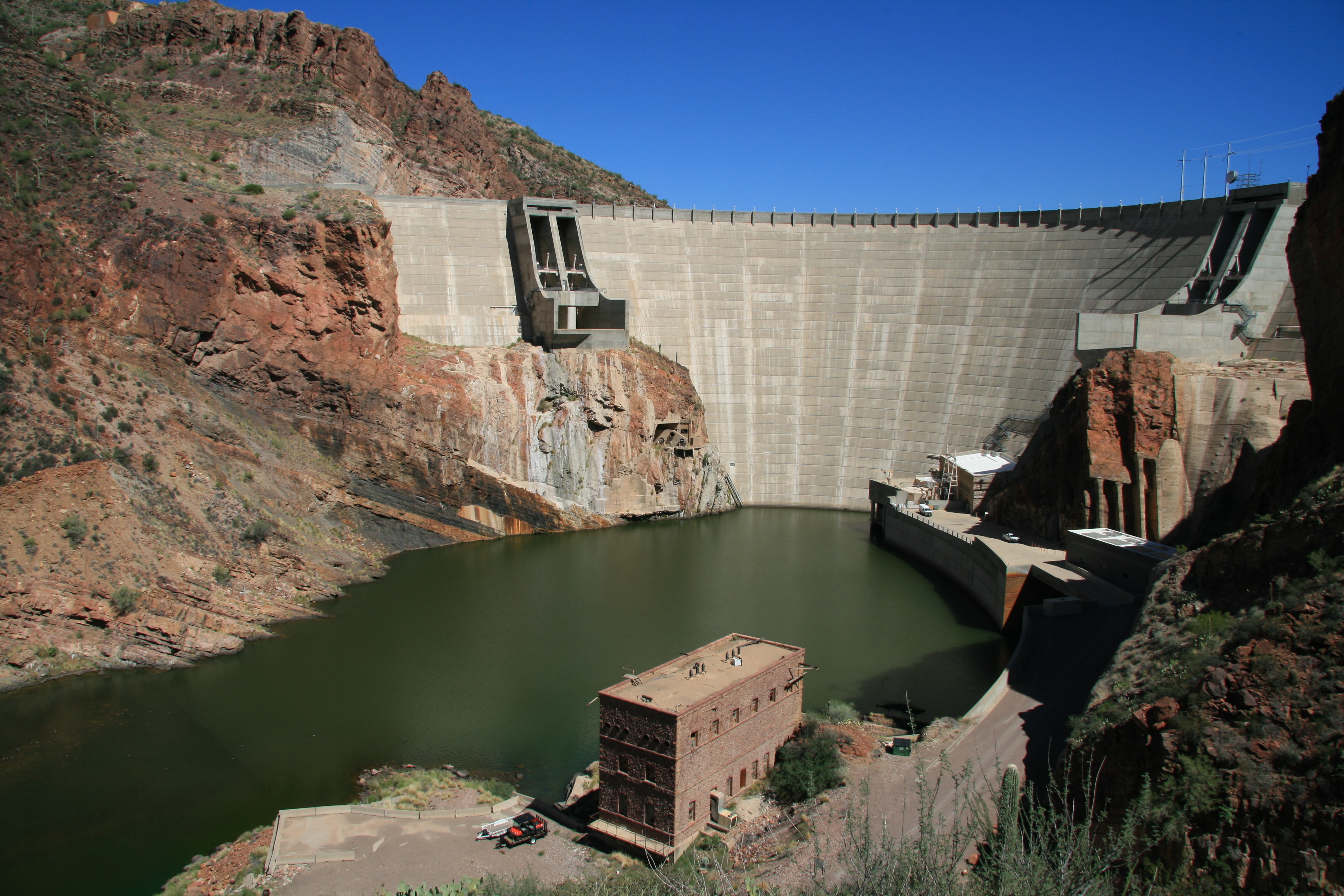 Dan rijden we naar het uitzichtpunt waar we goed zicht hebben op de immense constructie van de Roosevelt dam. Deze dam is geen vergelijking met bijvoorbeeld de Hoover dam of de Glenn Canyon dam, maar het blijft een enorme constructie. We rijden verder en zien aan de linkerkant de ruige Superstition Mountains en aan de rechterkant een van de blauwe meren. Samen met de blauwe lucht (we tikken weer de 100 graden aan vandaag) is het een mooi plaatje.