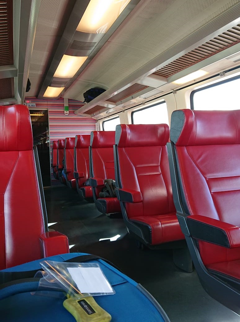 We eten en drinken wat bij Starbucks. Dan gaan we langzaam op weg naar perron 4. Ook die trein komt op tijd aan en voordat we het weten, zitten we – ook hier – in de 1e klas.