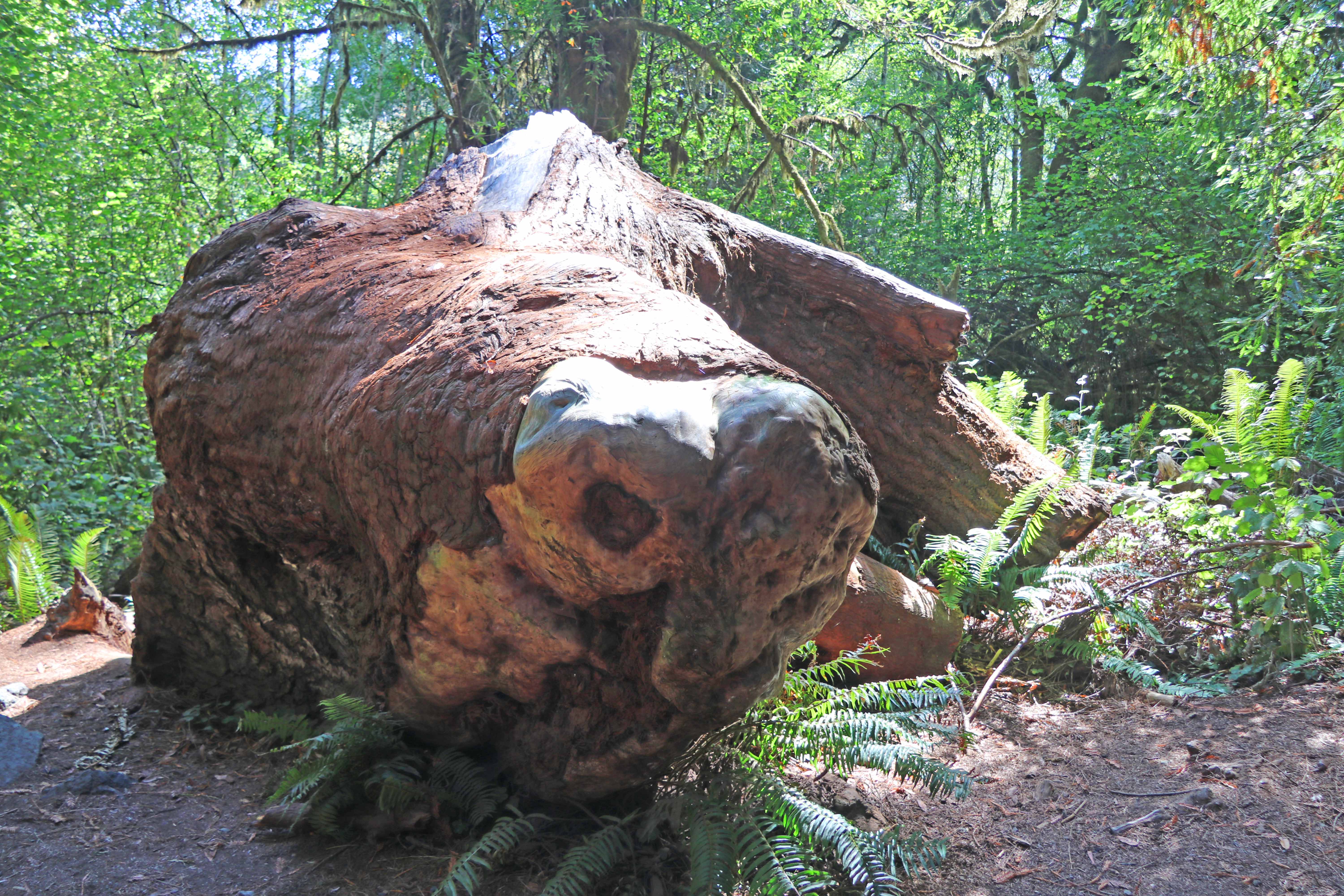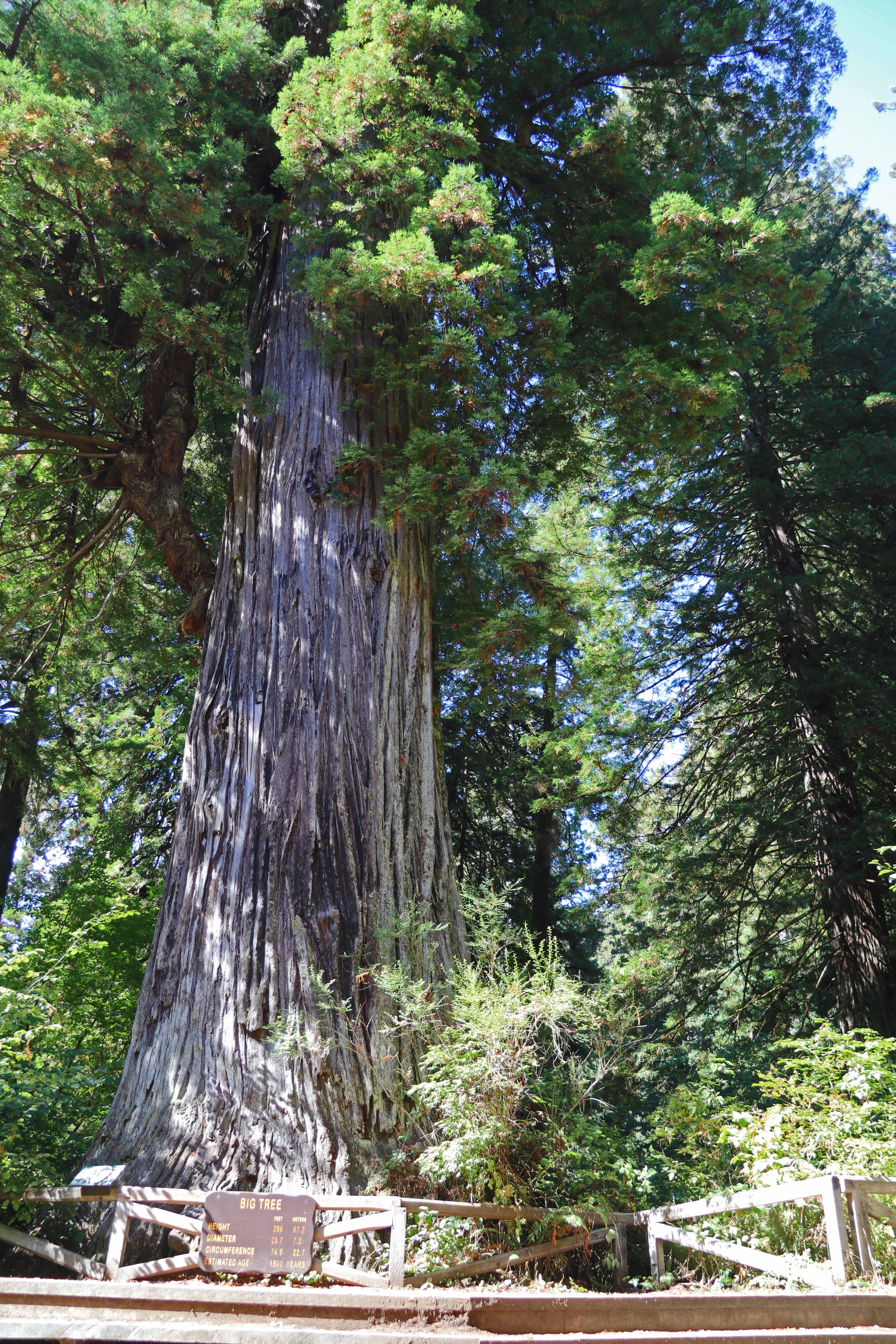 Als eerste lopen we naar de Big Tree. Deze boom is ongeveer 1500 jaar oud, is zo’n 88 meter hoog, heeft een omvang van bijna 23 meter en een doorsnee van 7 meter. Aardig uitgedijd, dus. Hij heeft een prominent plekje in het bos.