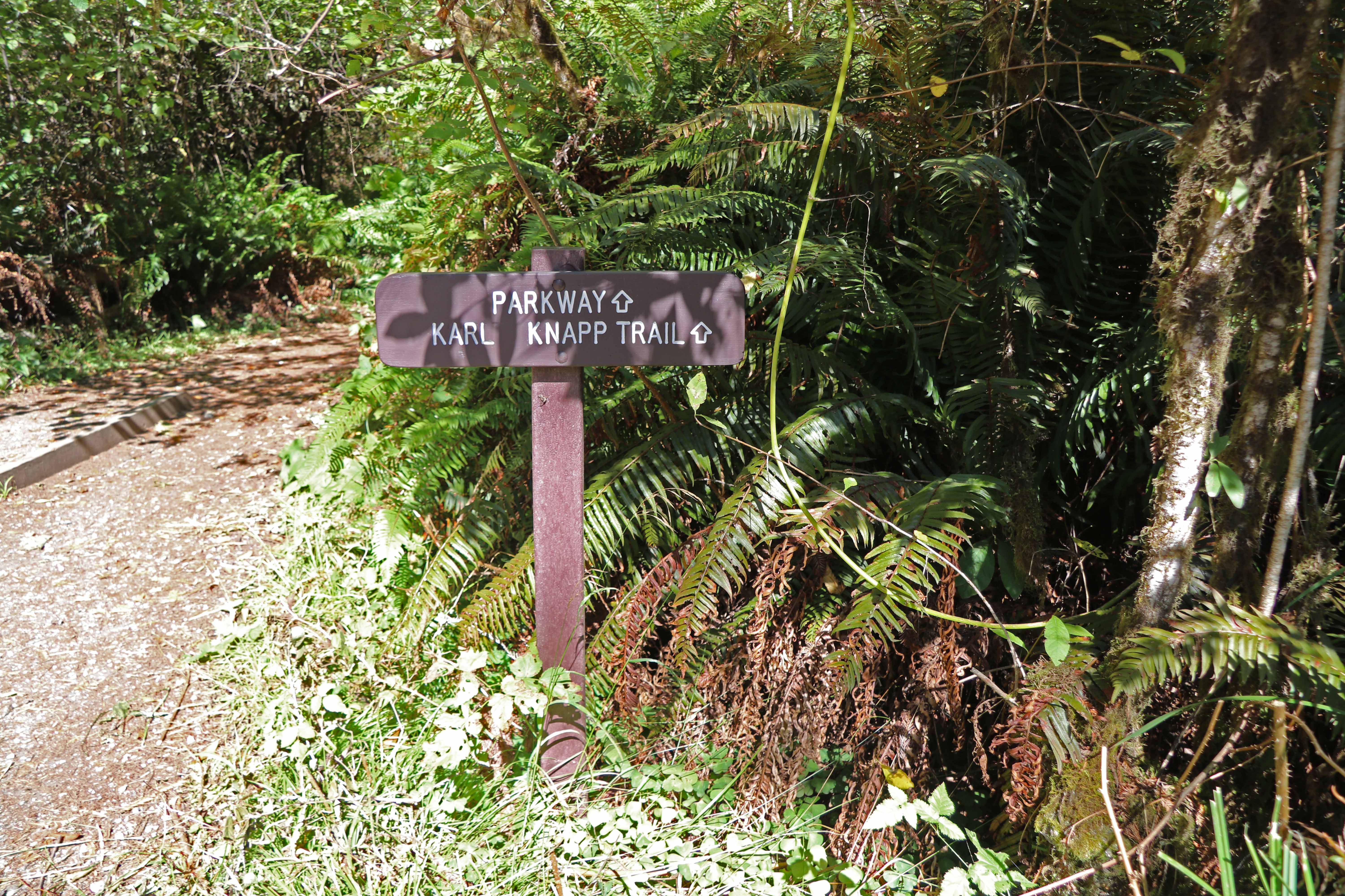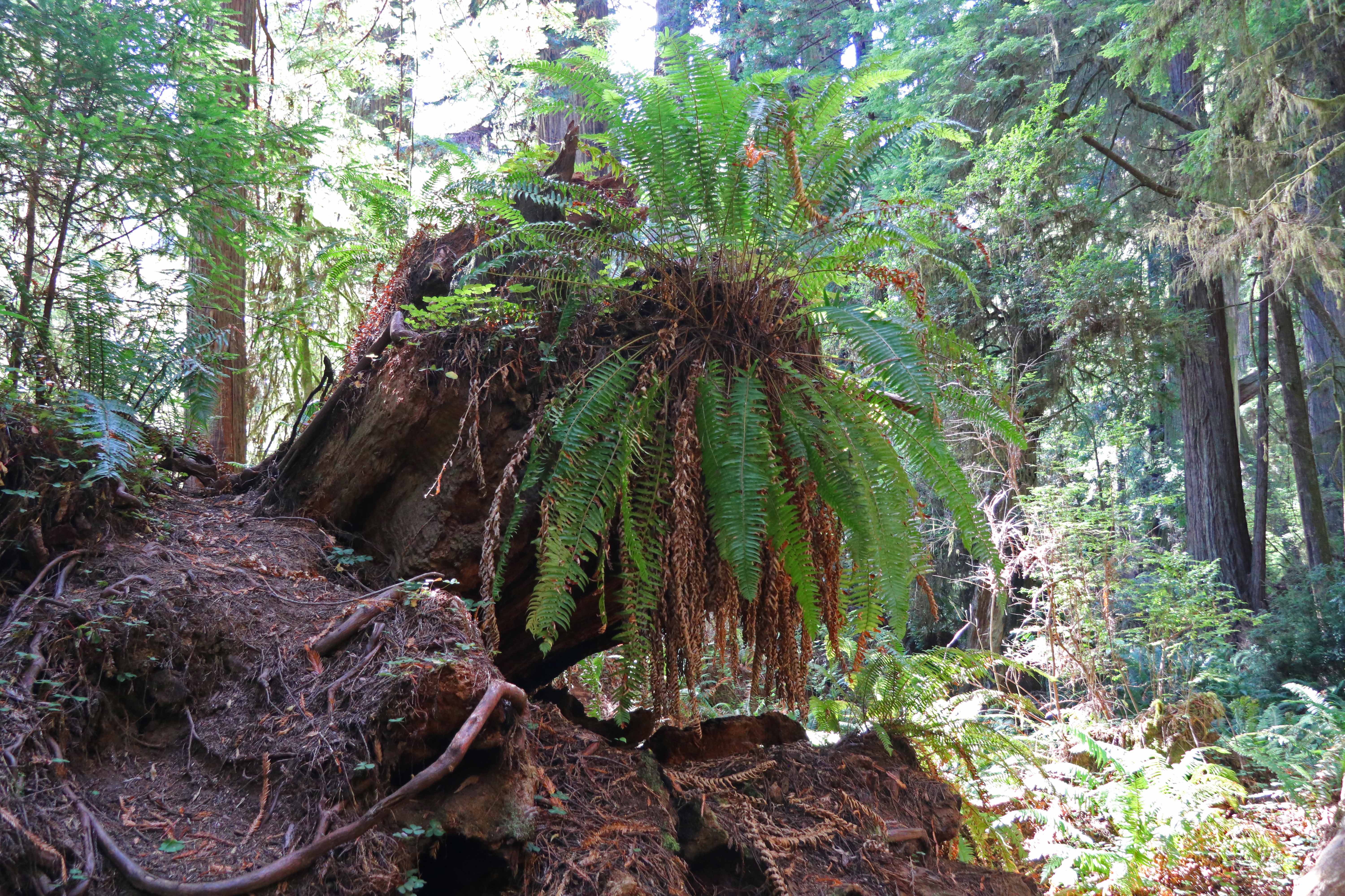 We beginnen aan de rest van de trail. Ook hier is het een en al varens en 50 shades of green. Maar het is niet te vergelijken met Fern Canyon van gisteren. Gisteren hoorden we niets anders dan natuurgeluiden. Kabellende beekjes, vogeltjes, af en toe wat geritsel van iets wat we niet kunnen zien. Hier horen we verkeer, want we lopen vlak langs de weg. Dat wordt wel minder als de trail verder gaat.
