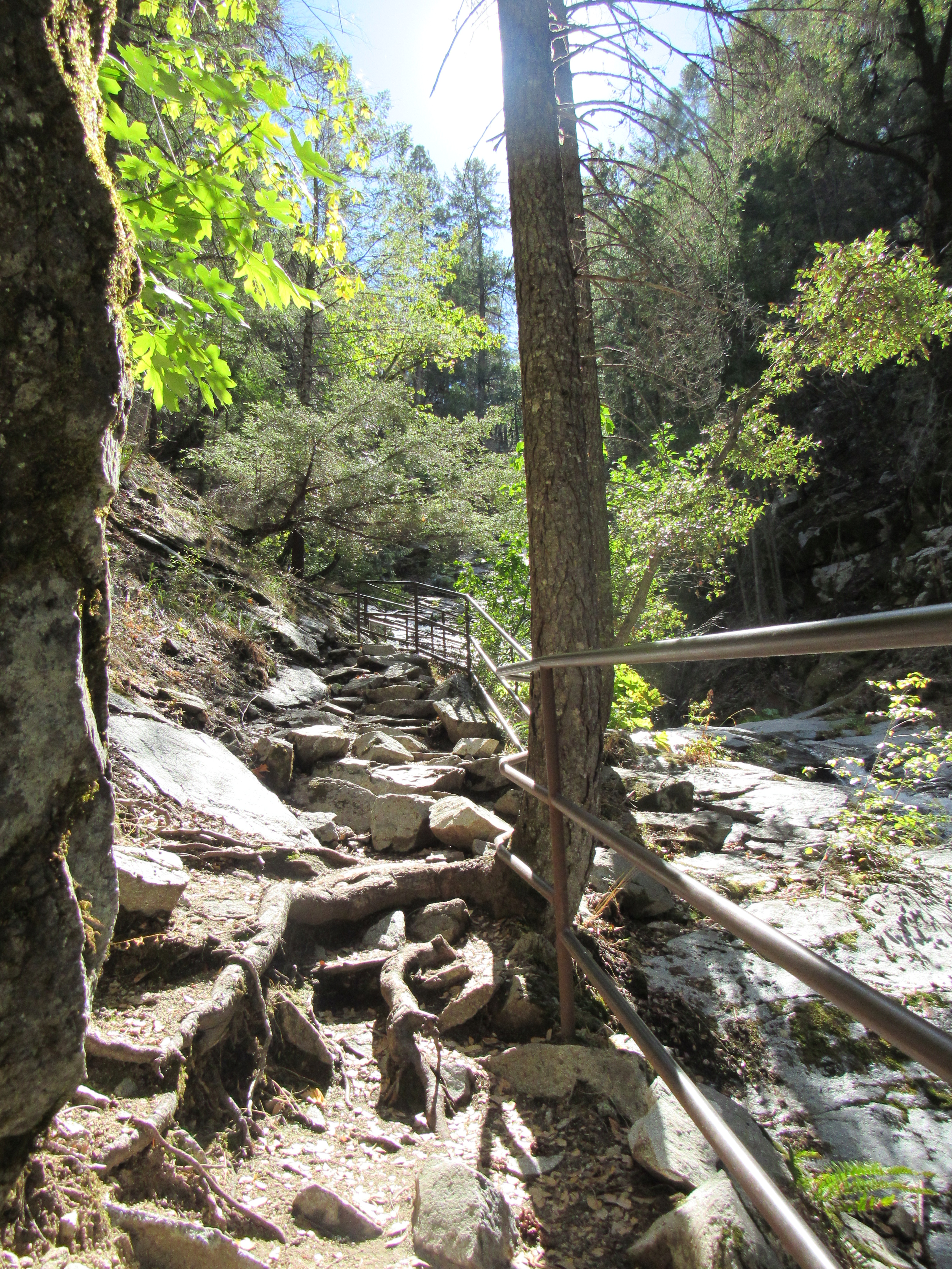 Na nog een paar bochten zien we de waterval. En het is er eentje! Niet zo groot, maar wel heel fijn. Er stroomt aardig wat water naar beneden. We lopen nog verder naar boven, tot we niet meer door kunnen. Het hek zit dicht, blijkbaar is het verderop te gevaarlijk.