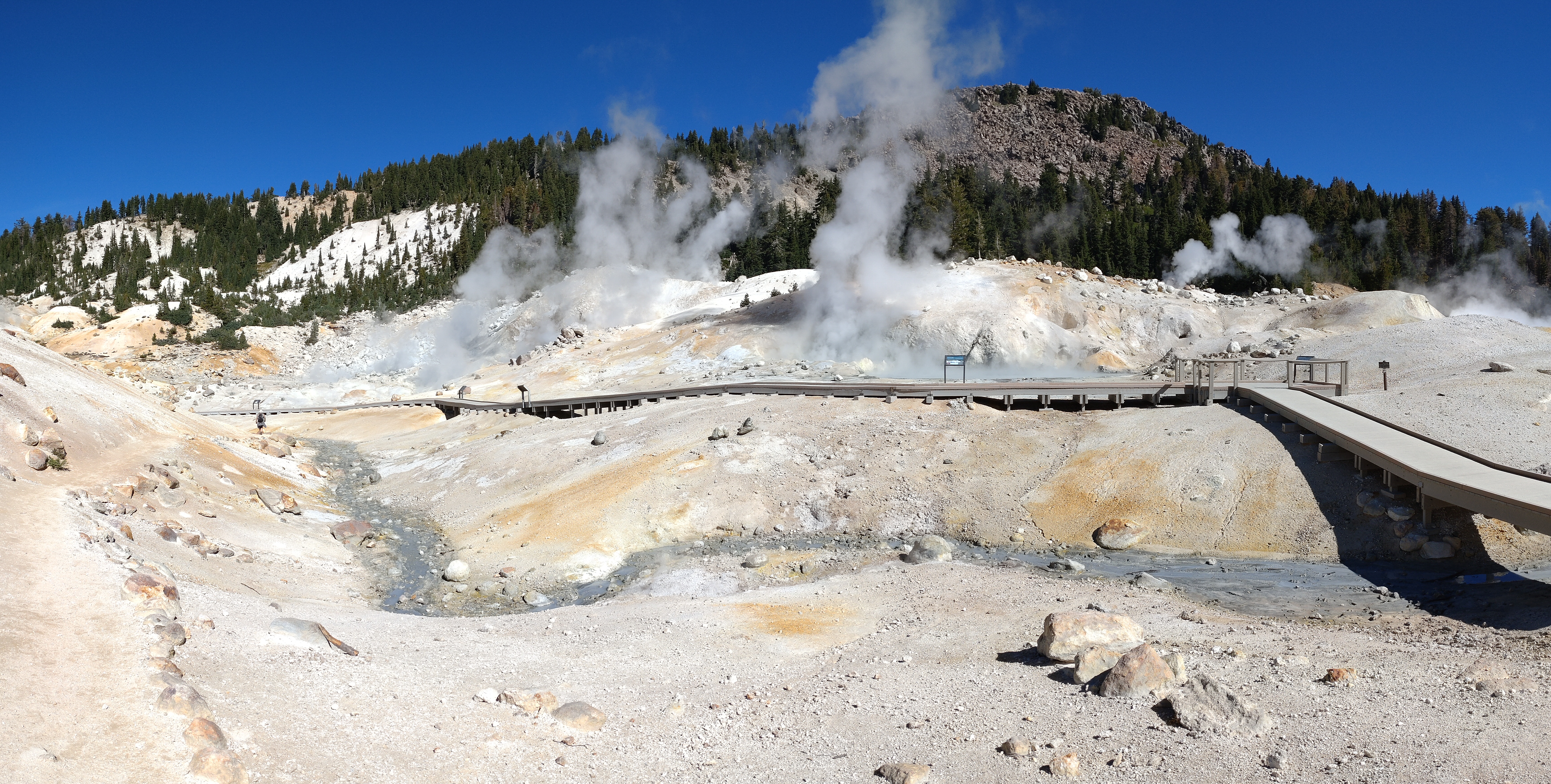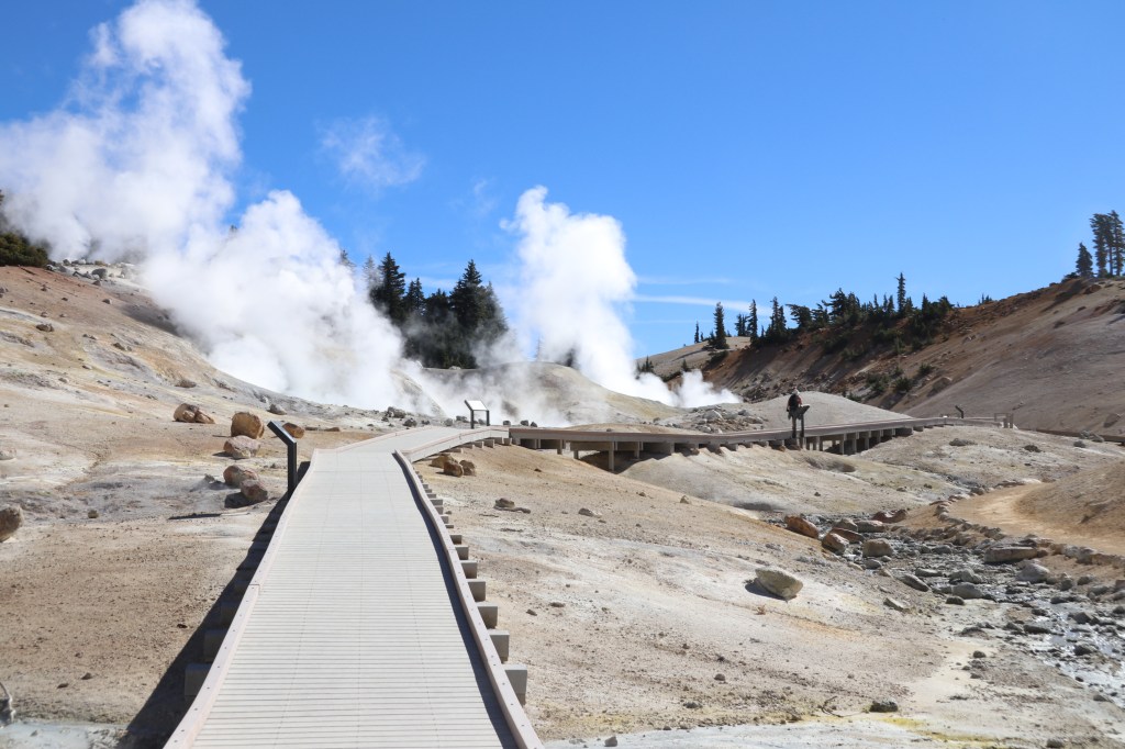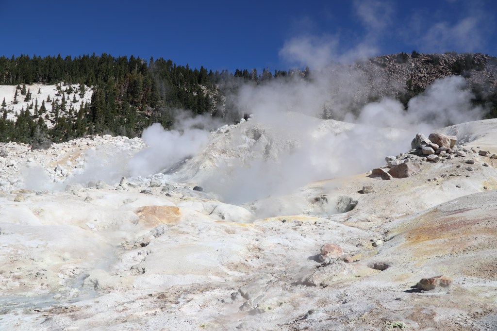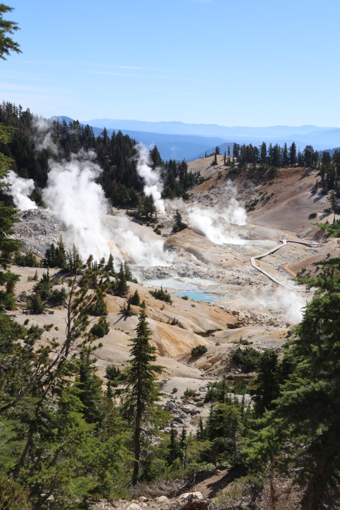 Ik kom als eerste bij het punt waar we op Bumpass Hell kijken. Het is net een mini Yellowstone met verschillende rokende modderpoelen. Ik noem ze pruttelpotten. Overal komt rook uit de grond. Gelukkig staat de wind gunstig vandaag, dus ruiken we de sulfur (oftewel rotte eieren lucht) niet of nauwelijks.