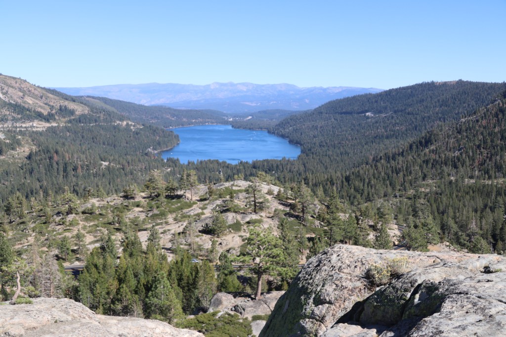 Nadat we een paar kilometer hebben gelopen en we in de verte Donner Lake zien liggen, vinden we het tijd voor een Cliffs bar. Even een rustmoment. Daarna besluiten we om te draaien en terug te lopen naar de parkeerplaats. Het is een tricky pad, er liggen keien, stenen en grote rotsblokken. Monique noemt het enkelbrekers en dat klopt wel. Je moet goed opletten waar je je voeten zet.