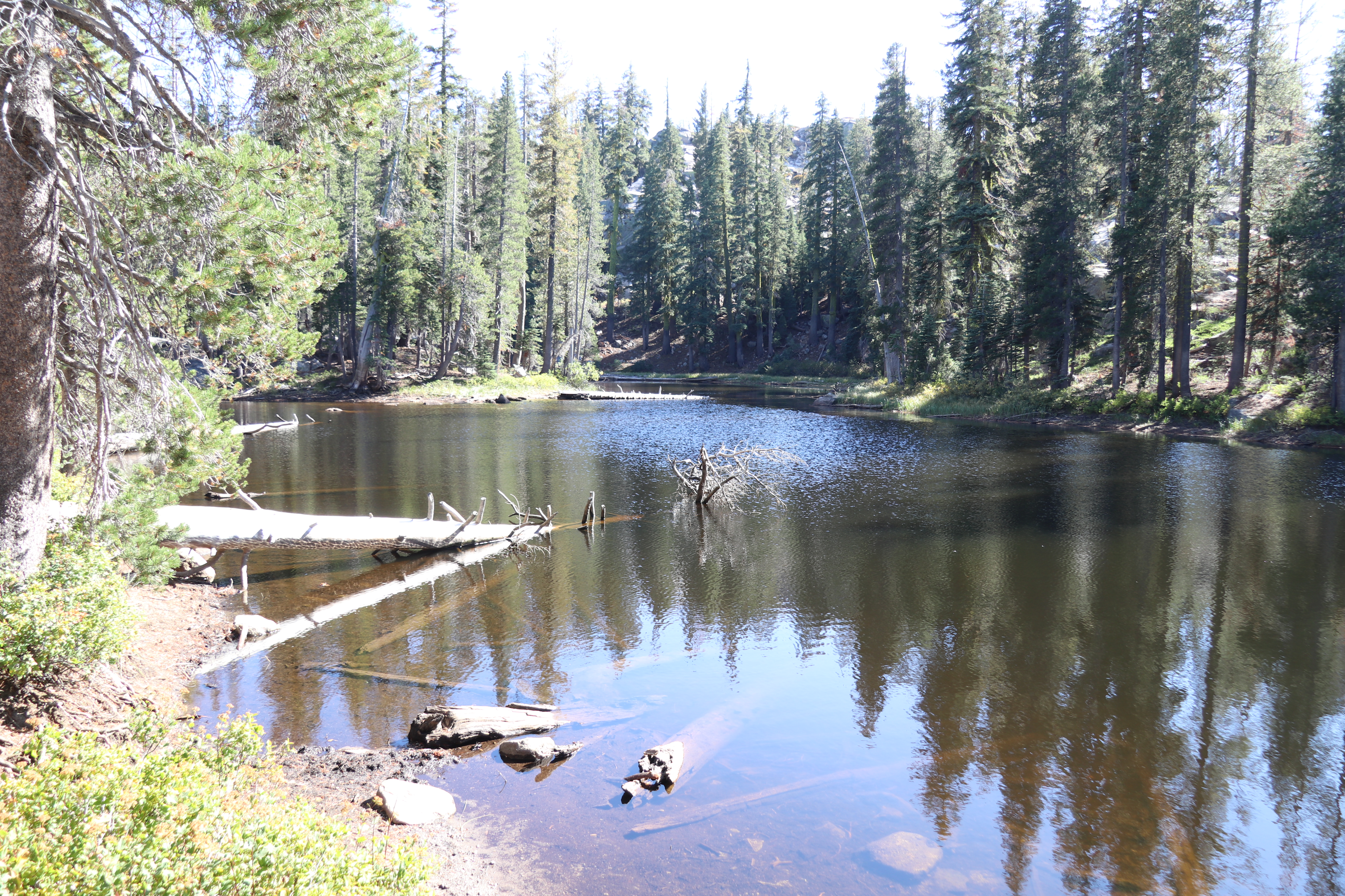 Na een tijdje komen we langs een meer. Ik vermoed dat het Azalea Lake is, maar dat staat nergens aangegeven. Ook staan er geen bordjes meer langs de trail. Dat maakt ons niet uit. Wij lopen stug door. Een tijdje later komen we langs een tweede, wat lijkt op een grotendeels drooggevallen, meer. Dit is of was Flora Lake. Maar de trail lijkt niets op de trail waarvan we de beschrijving hebben.