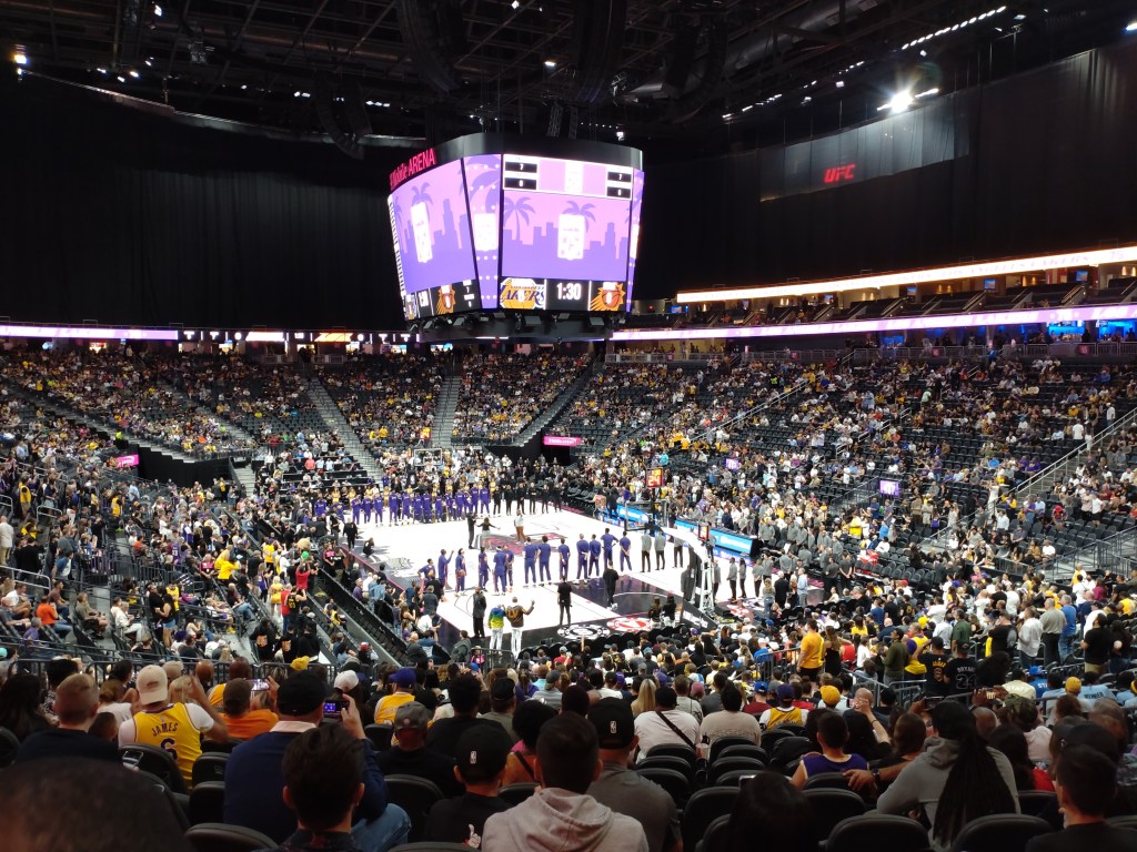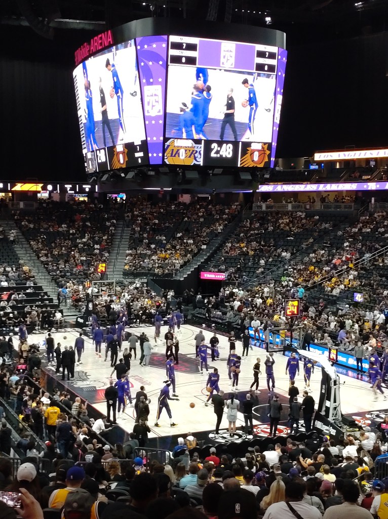 Vanavond is er een oefenwedstrijd (preseason game) van de LA Lakers in het T-Mobile Stadium hier. En ook wij hebben hier kaartjes voor. We sjeezen zo snel mogelijk naar de kamer, droppen onze spullen en gaan dan snel richting het stadion dat gelukkig aan de overkant ligt. In de lift naar beneden staat een man die een LA Lakers shirt aan heeft. Hij vraagt of we flink geld gaan verbrassen, maar ik vertel hem dat we naar dezelfde wedstrijd gaan als hij. Dat kan hij waarderen.