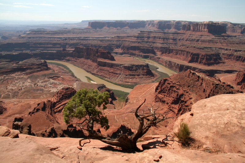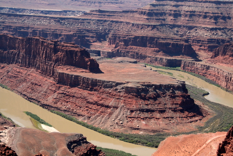 We gaan nog naar een outdoorwinkel, Gearheads, en kijken daar even rond, maar we kopen alleen wat energie boosters. Dan besluiten we om nog “even” naar Dead Horse Point State Park te gaan. Dit park ligt voor Canyonlands National Park, maar kijkt wel uit over Canyonlands NP. Sterker, precies onder Dead Horse Point ligt het punt waar Thelma and Louise de canyon inreden. Daar aangekomen, betalen we de fee en rijden naar de parkeerplaats. We lopen naar het uitkijkpunt en zoals altijd is het om stil van te worden. We zeggen niets, want er is met geen woorden te beschrijven hoe mooi het hier is!