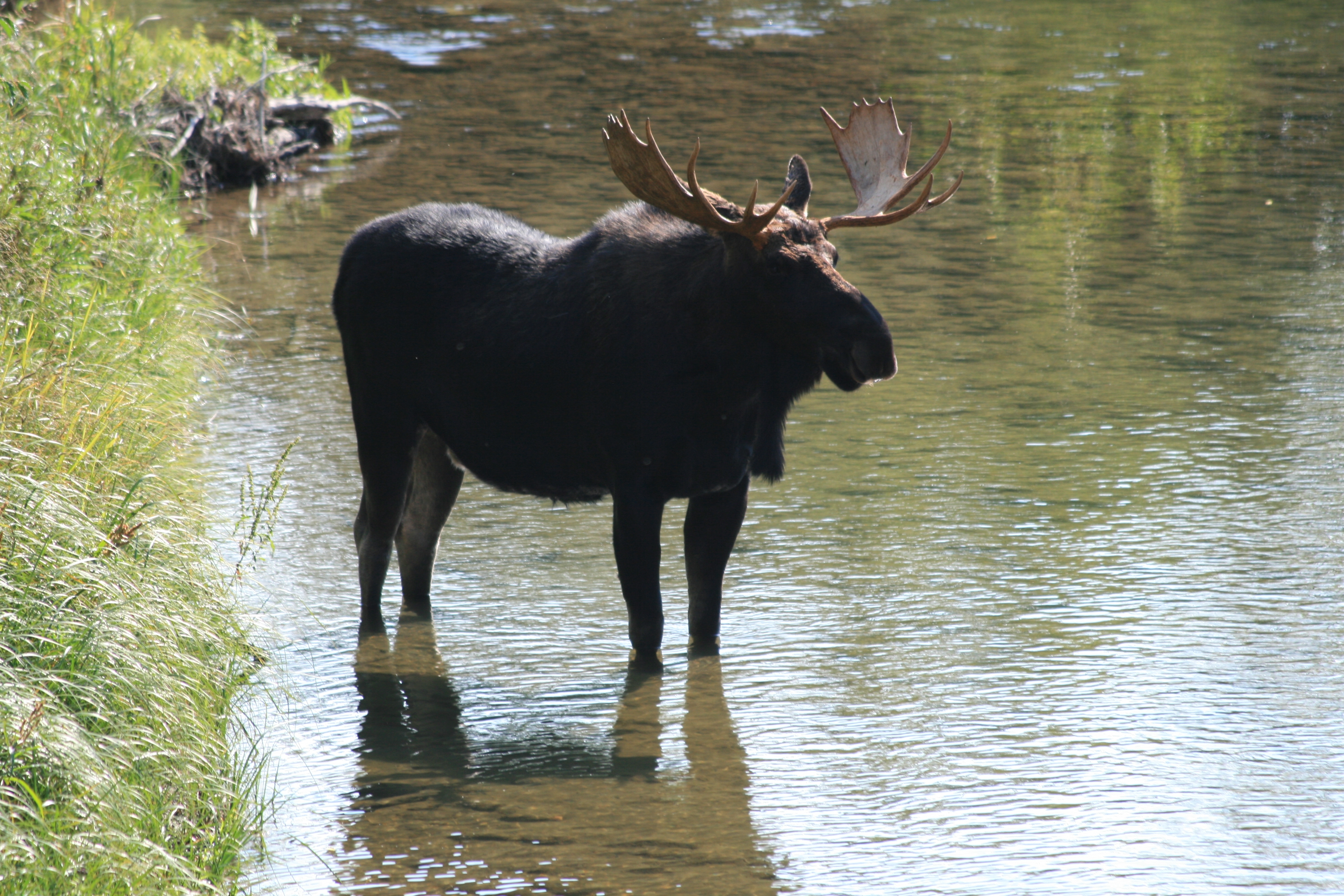 Als Monique klaar is met foto’s nemen bij Mormon Row, rijden we terug naar het park. Opnieuw zien we veel mensen staan langs de rivier (Snake River). Nu zetten we de auto wel stil en lopen naar de rivier. Ik zie 2 donkerbruine vlekken die niet tussen het groen passen en ik zeg tegen Monique dat het op een eland lijkt. Monique durft het niet te geloven, want elanden zijn erg schuw en die laten zich dus niet zo snel zien!
