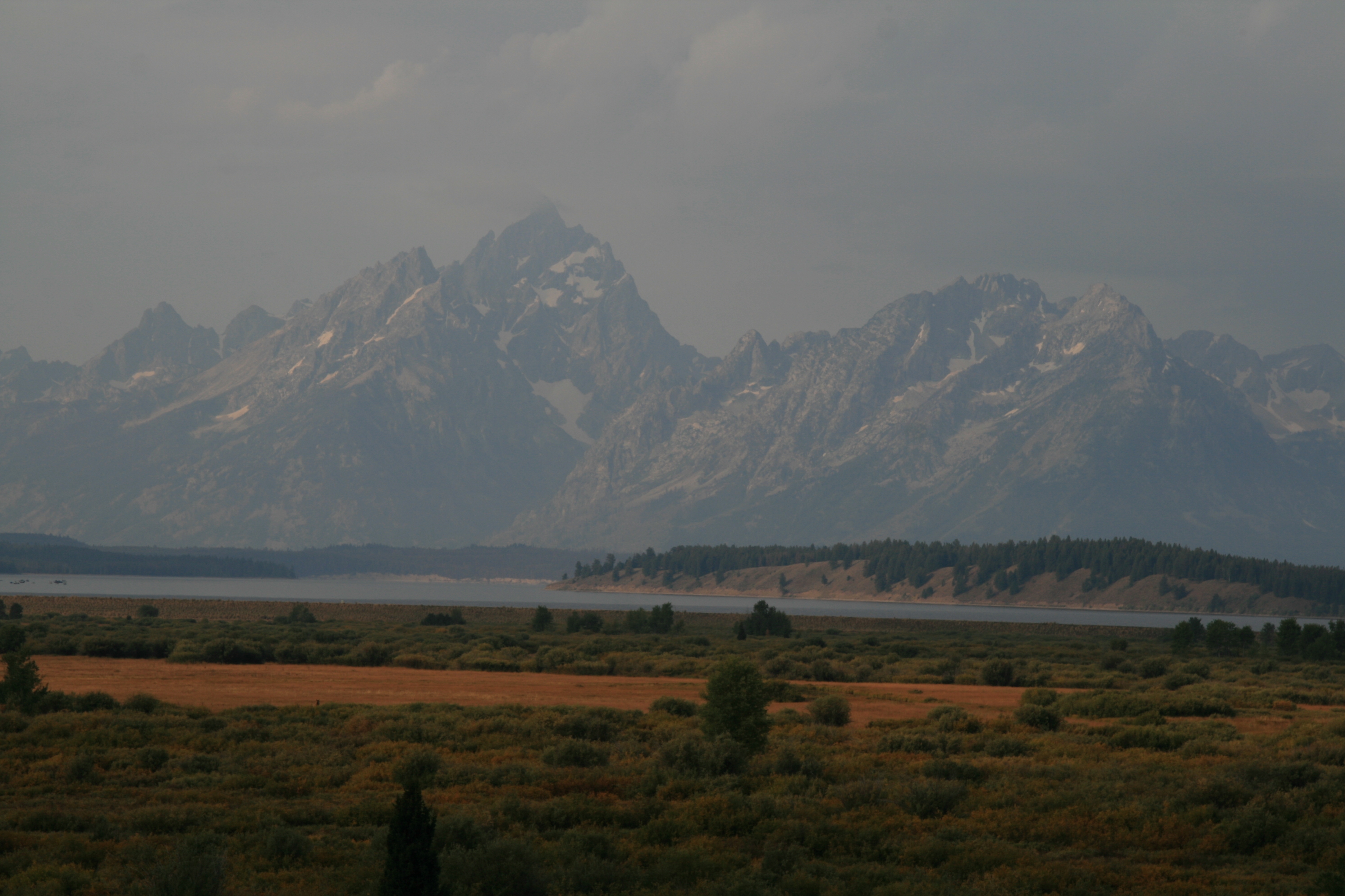 Gelukkig lijkt het een kort buitje te zijn en we gaan, na een kop koffie en een zak ijs te hebben gehaald, op weg naar Willows Flat Overlook. Hier moet je ongeveer 2 uur na zonsopgang een geweldig uitzicht hebben op de Tetons. Maar het valt tegen door de bewolking en de regen. Wel lopen we een stukje de trail op om nog wat dieren te spotten, maar die schuilen ook!