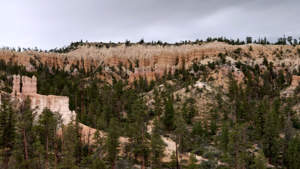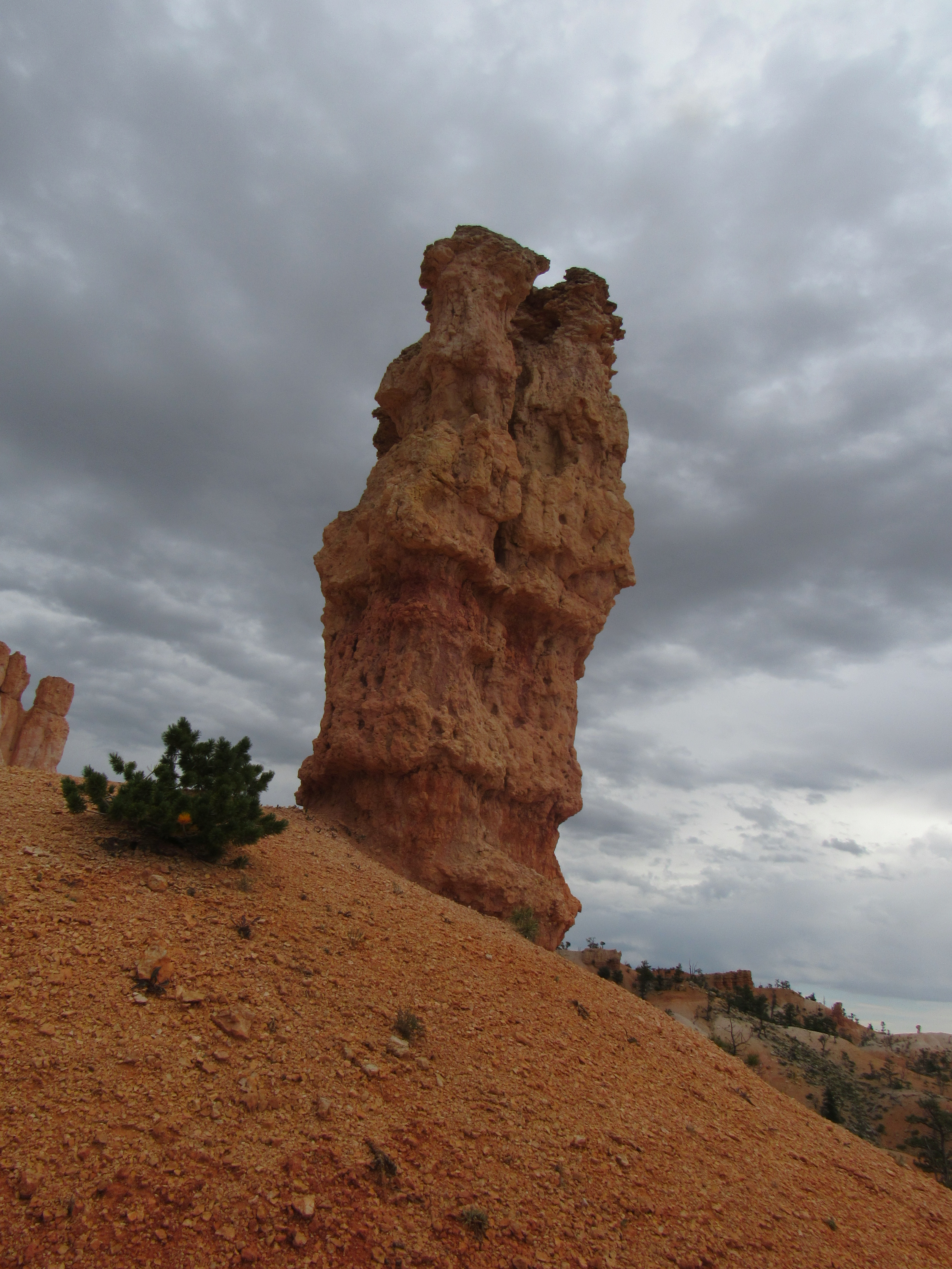 Terwijl ik hier op Monique wacht, maak ik een praatje met twee andere bezoekers. Zij willen weten waar ik vandaan kwam lopen. Ik vertel dat we de Fairyland Loop trail lopen, maar dat het regenachtig en heel winderig is. Zij besluiten om maar door te lopen naar Tower Bridge Point dat een paar honderd meter verderop ligt.
