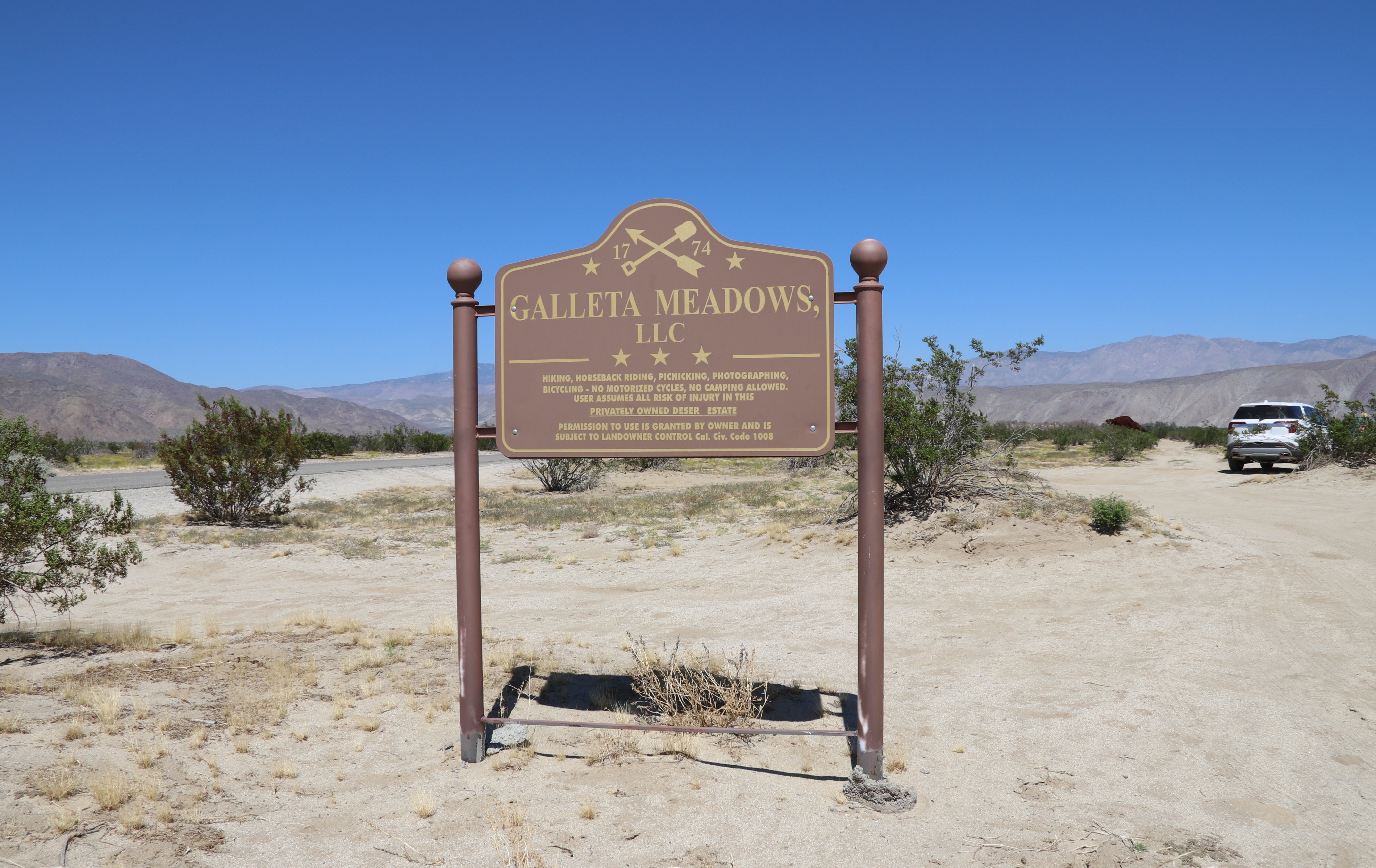 Het landgoed is niet omheind en is open en vrij toegankelijk voor publiek. Borrego Springs ligt middenin het Anza-Borrego Desert State Park, het grootste staatspark van Californië.