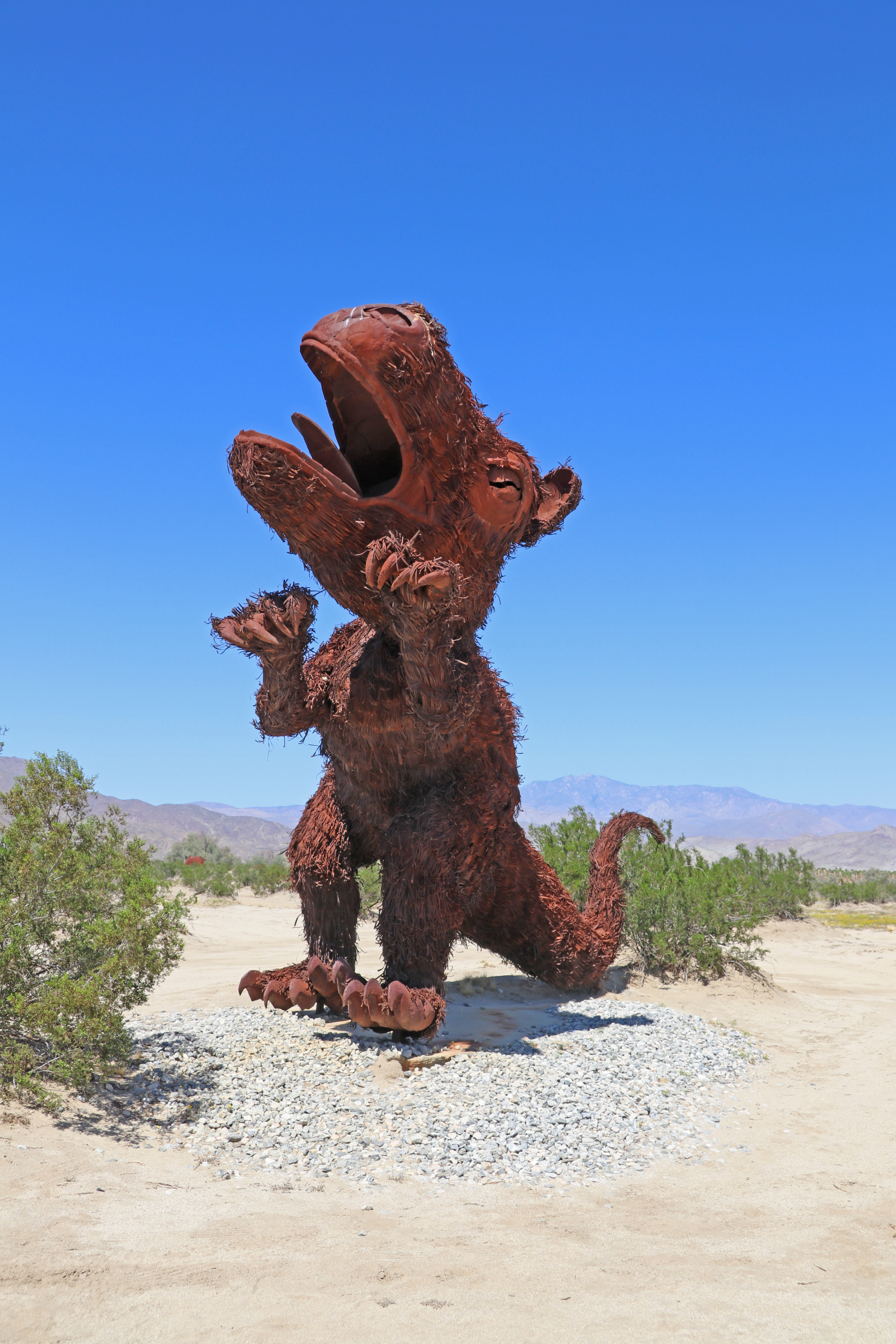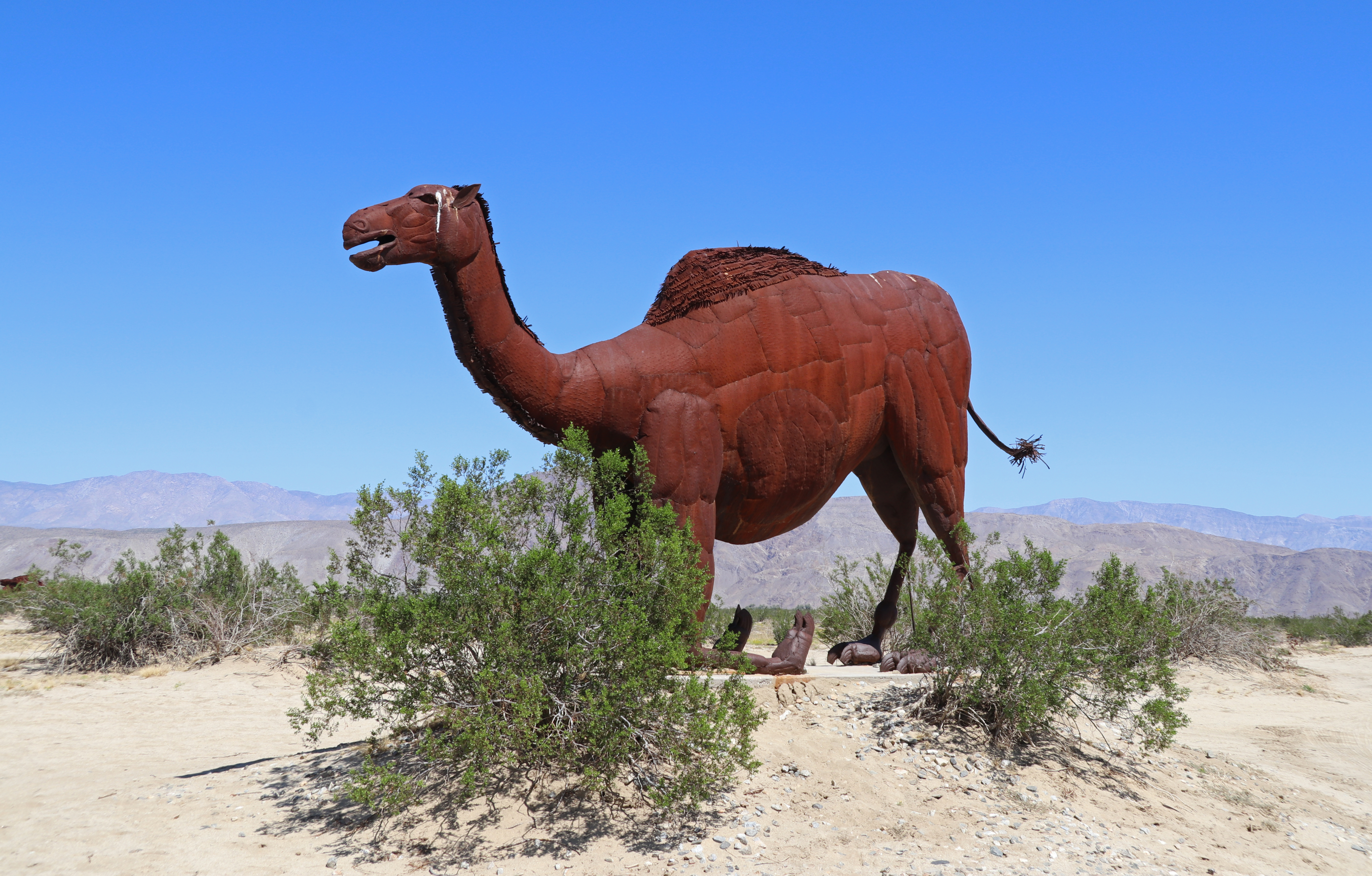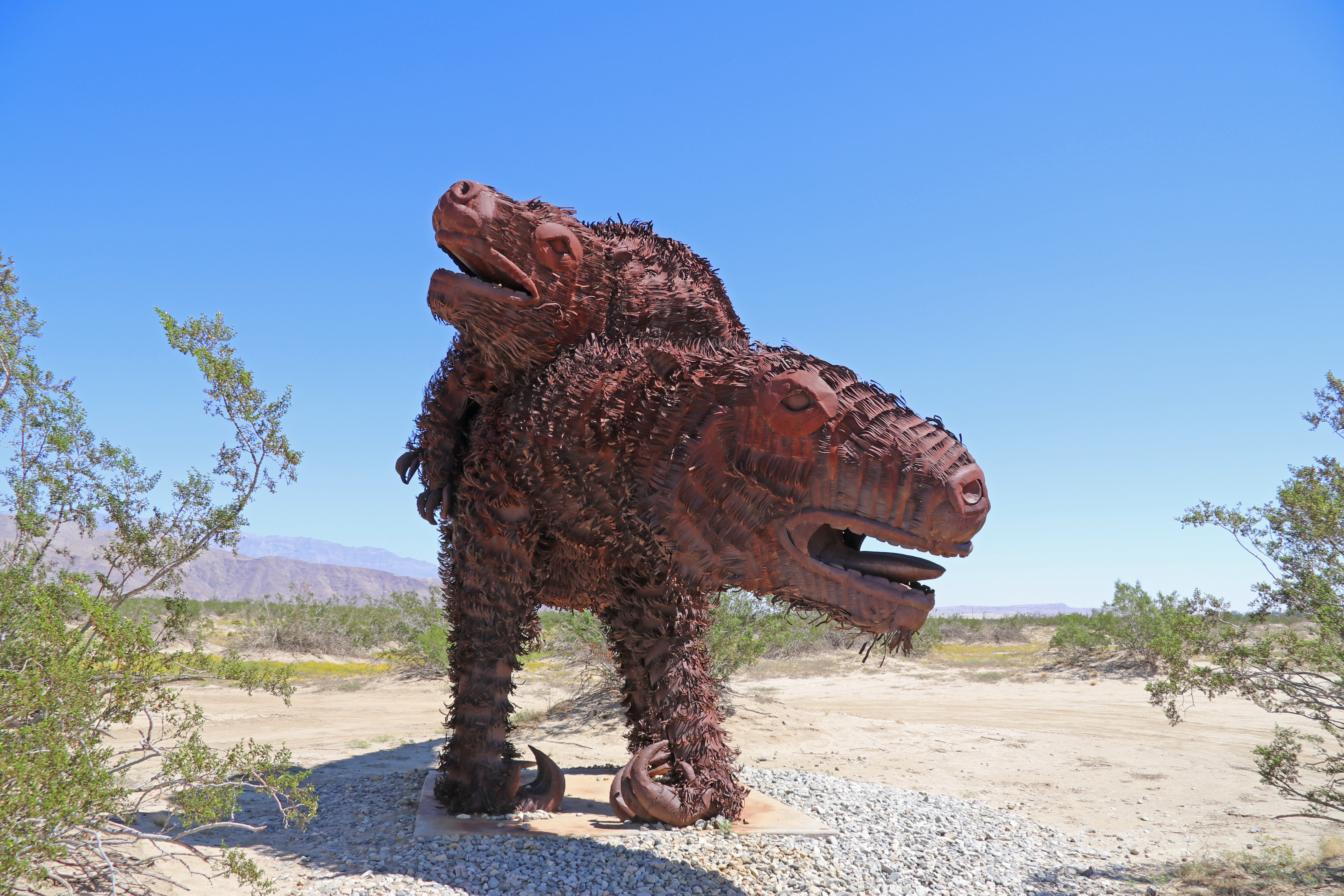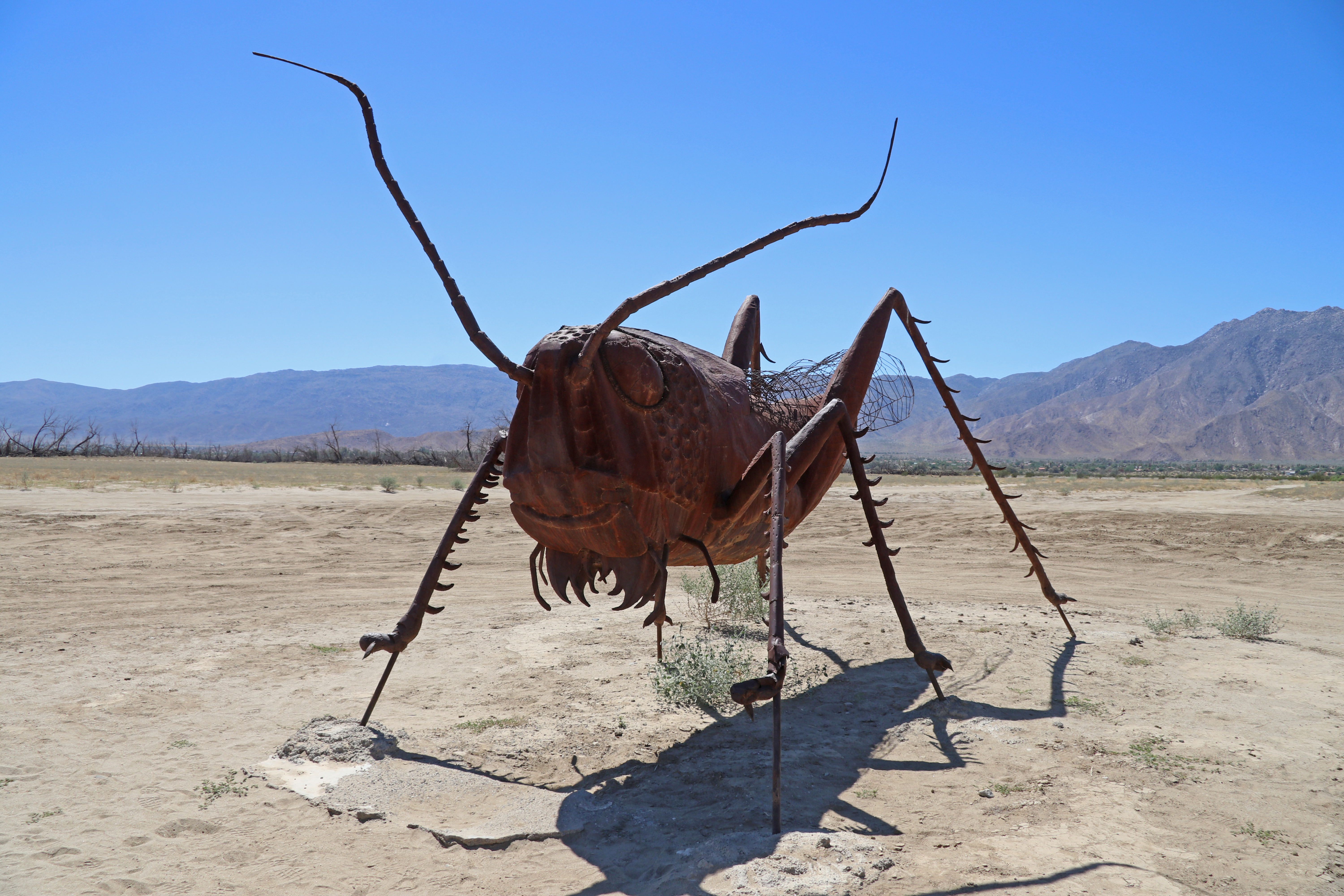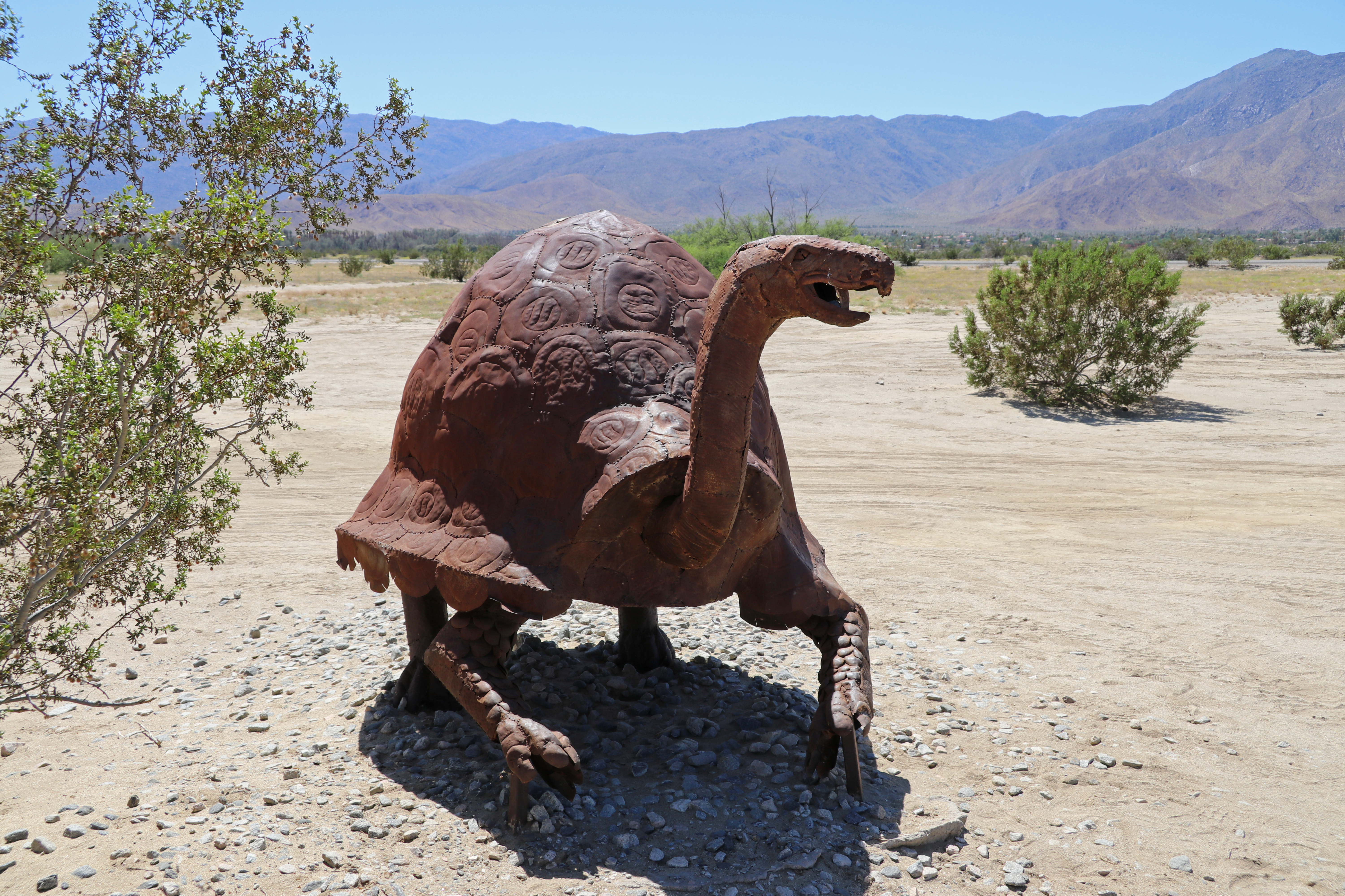 We drinken rustig een bakkie koffie en gaan dan ons ding doen. Als we klaar zijn, drinken we nog een bakkie leut en bedenken wat we dan gaan doen. Monique heeft gelezen over de Galleta Meadows Sculptures in Borrego State Park, dus gaan we daar naar toe.