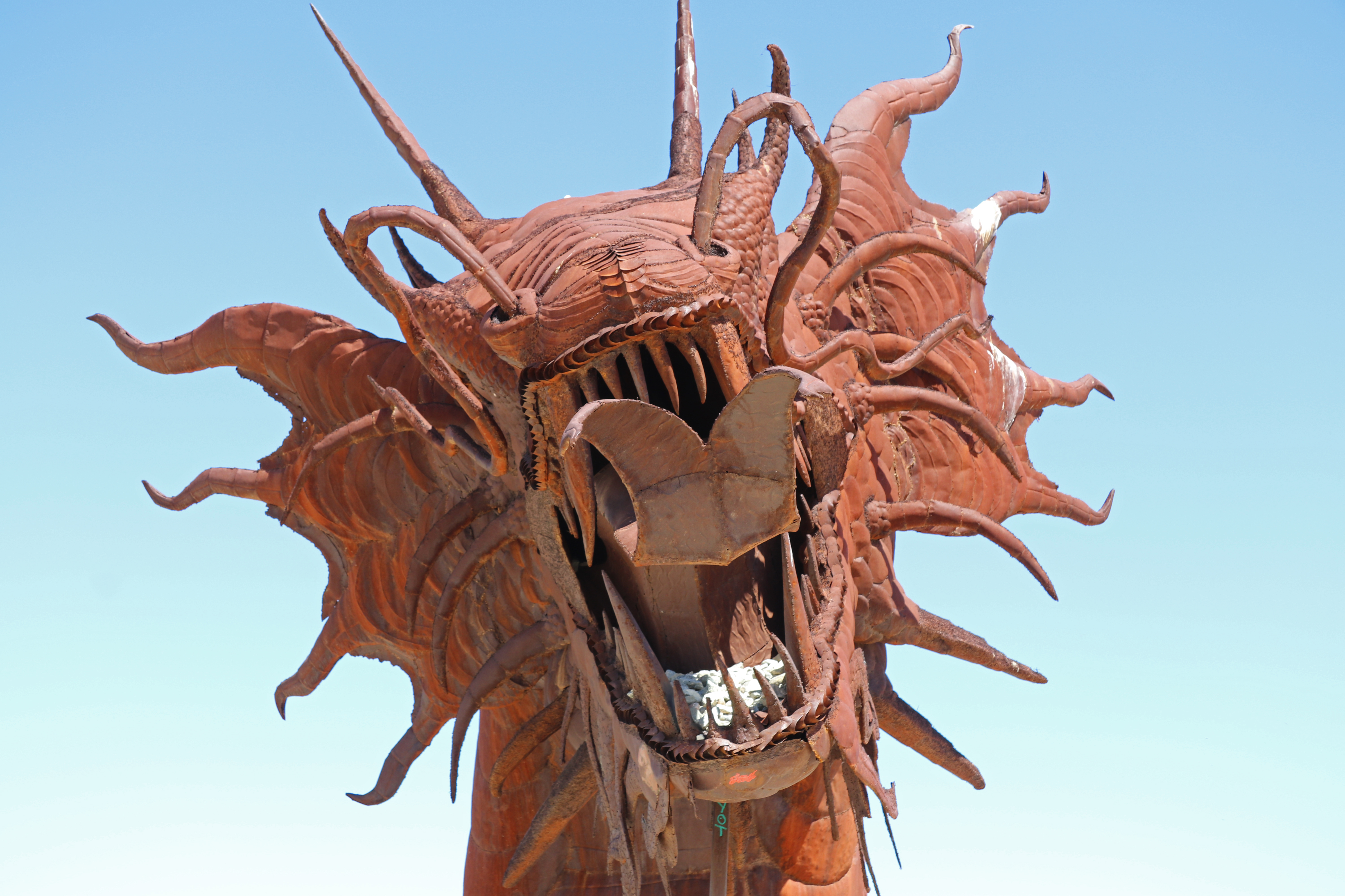Al snel zien we de sculpturen boven de begroeiing uitsteken. We rijden het gebied in, want het is te heet om te gaan lopen. Wel stappen we regelmatig uit en als het kan, lopen we naar de verschillende sculpturen. Ze zijn volledig van metaal en het doet een beetje vreemd aan in deze omgeving.