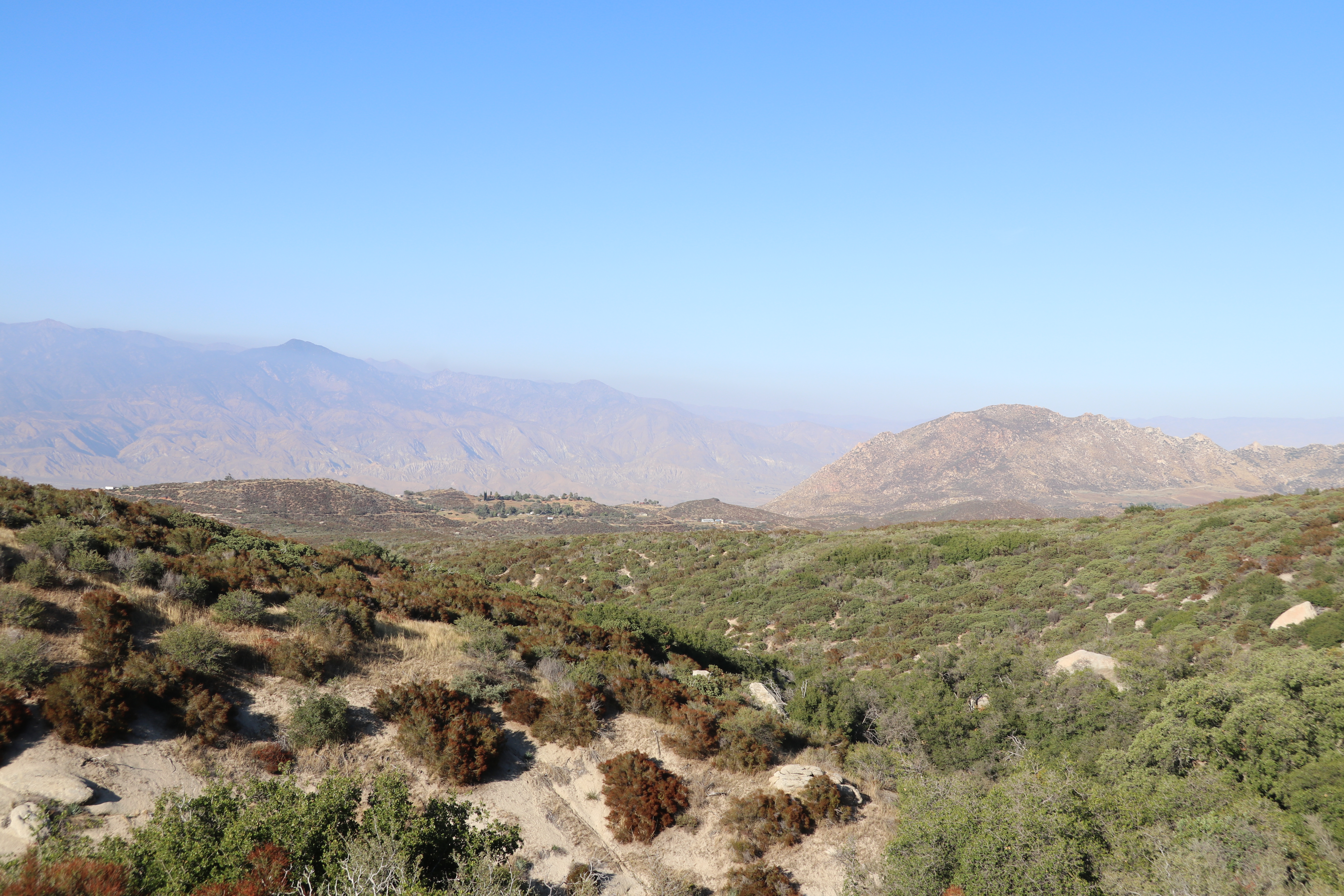 Om de warmte wat te ontvluchten, rijden we terug via de bergen van San Bernardino. We zien prachtige uitzichten, maar geen mogelijkheden om te stoppen. Dat is jammer. Daarbij is het ontzettend heiig en zien we nog steeds een enorme waas van zand in de lucht hangen. Gelukkig hebben we er geen last van, maar het is wel zonde voor de foto’s.