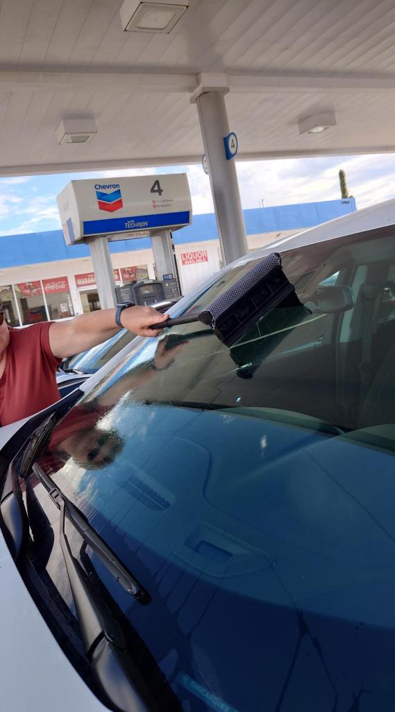 Het waait heel hard vandaag, wat het zand in de lucht nog erger maakt. Het is niet normaal hoe slecht het zicht is. Voordat we de I10 East opdraaien, stop ik nog een laatste keer bij het tankstation. Terwijl ik sta te kijken hoe de tank volloopt, en Monique de voorruit schoonmaakt (verschil moet er wezen), voel ik het zand om me heen waaien.