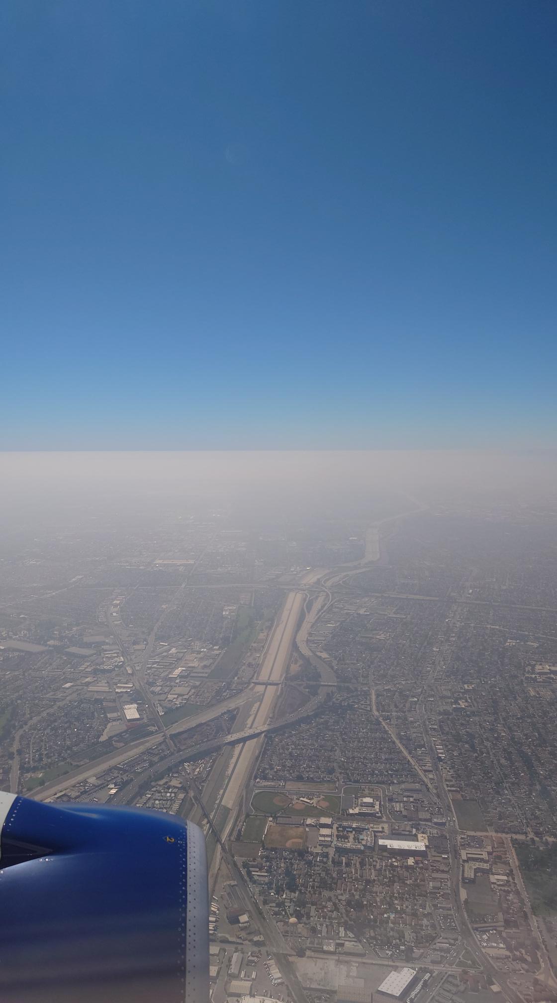 Zowaar vertrekken we 4 minuten eerder dan gepland. We zien enorme smog boven LA, maar al snel vliegen we op hoogte. We worden voorzien van eten en drinken en na verloop van tijd wordt de verlichting gedimd. Ik kijk wat series op mijn telefoon, maar sluit die op een gegeven moment af. Ik wil hoe dan ook proberen wat te slapen.