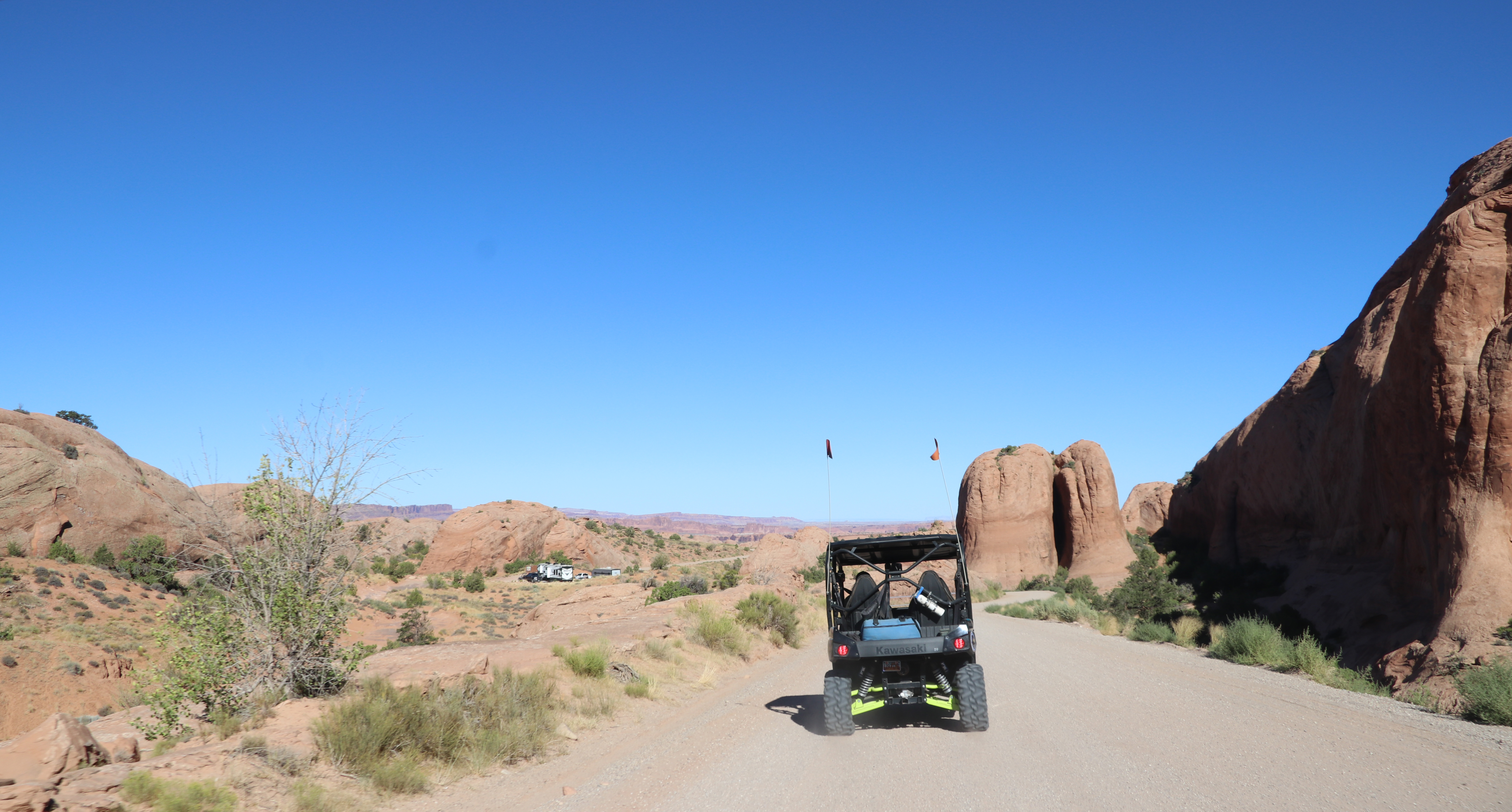 We scheuren zigzaggend door het zand heen. Ik geniet. Dit is wat ik wilde. Dan komen we weer bij het slickrock en kijken we tegen een muur aan. Die lijkt zo ongeveer op 150 graden omhoog te gaan. Aaron geeft gas en staat voor ik het weet bovenop de rots. Dan volg ik en even lijkt het alsof we achterover gaan hellen, maar ik geef nog een dot extra gas en sta dan ook boven. Aaron geeft een duim omhoog om aan te geven dat ik het goed heb gedaan.