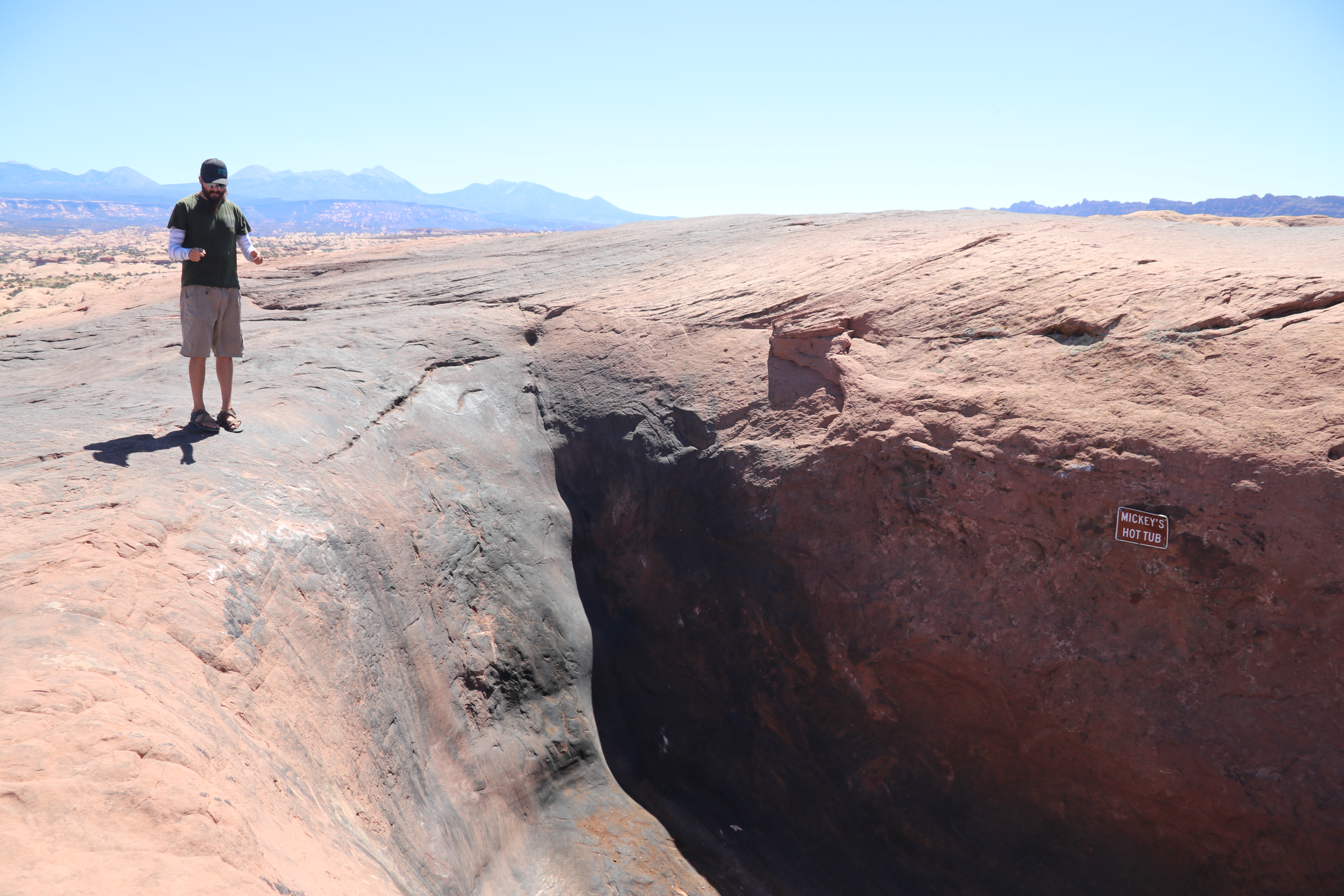 Op een gegeven moment stoppen we bij Mickey’s Hot Tub, een kleine kuil waar sommige stoere mannen met nieuwe jeeps (ja, dit is sarcastisch bedoeld) proberen om in en uit de kuil te rijden. Aan het glas en de olievlekken te zien, lukt dat over het algemeen niet. Ik vraag Aaron wat er gebeurt als auto’s hier niet uitkomen. Dat is een dure grap en je verschijnt ook nog op YouTube. Er is namelijk maar een bedrijf die je auto hieruit komt halen.