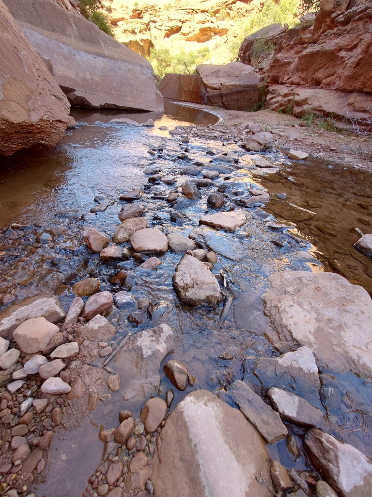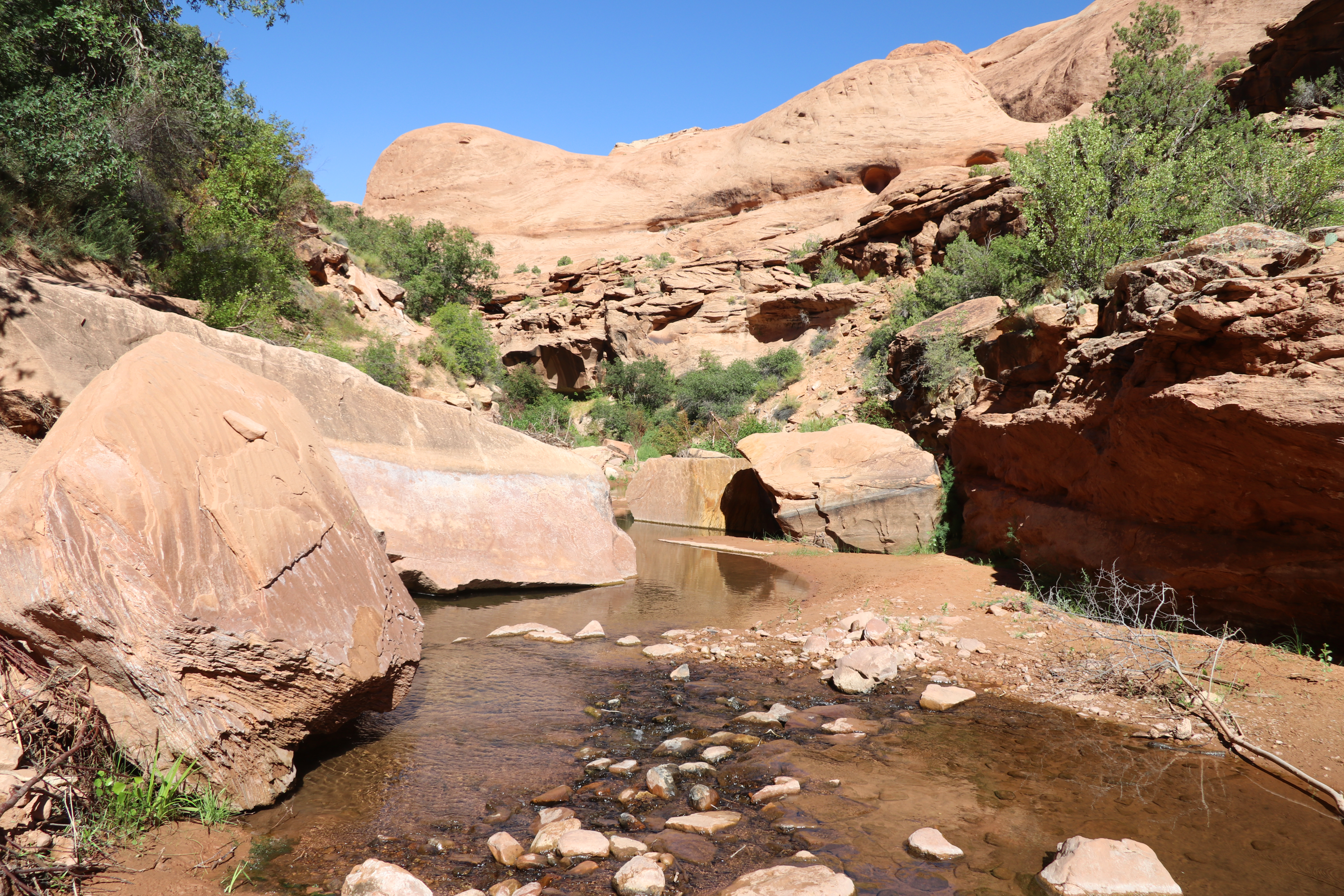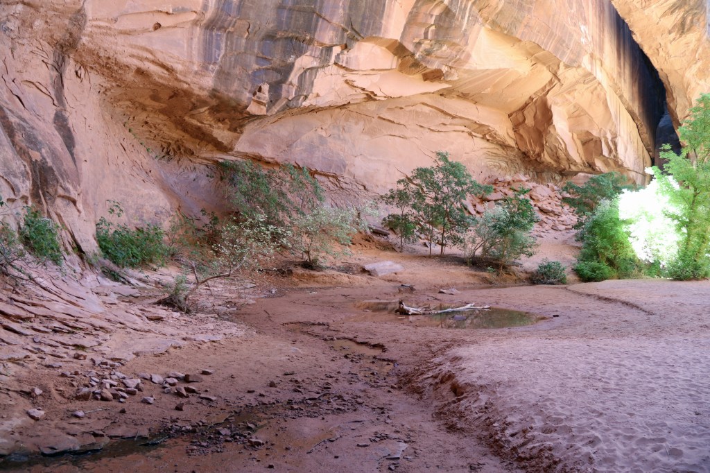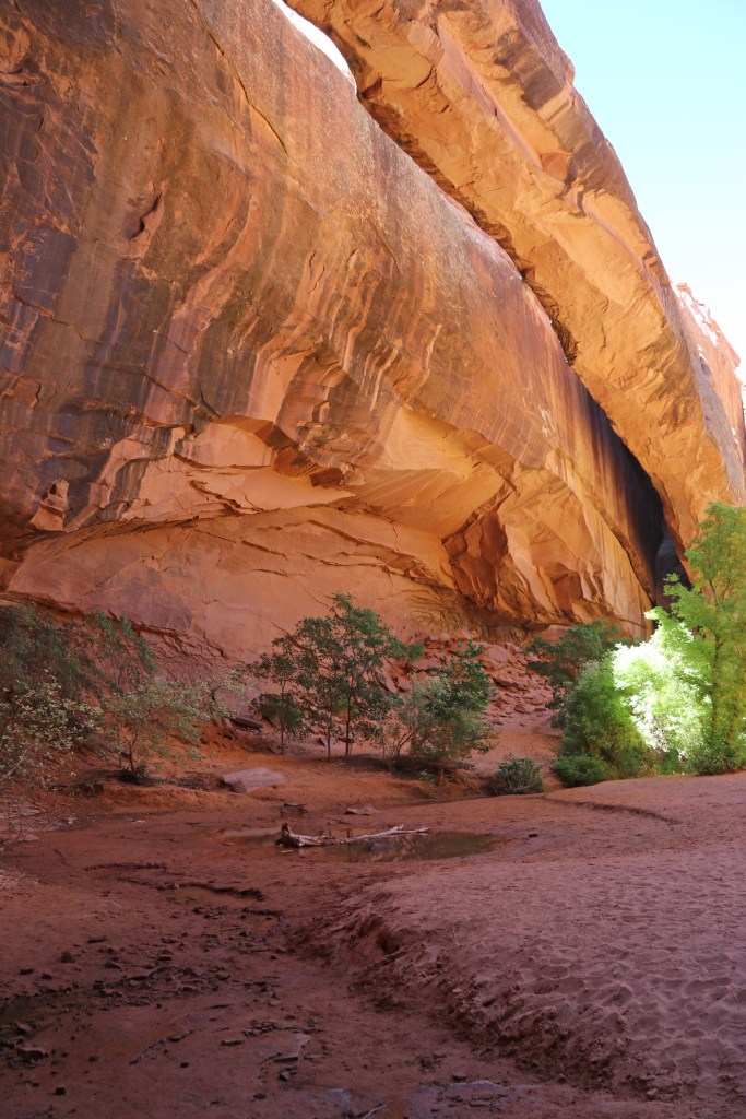We lopen het laatste stukje nog verder en zien dan de arch van dichtbij. Hij is groot en hoog! We zijn hier inderdaad alleen en ik gooi meteen mijn rugzak af en begin met foto’s maken. Daarna ga ik rustig zitten genieten van de oorverdovende stilte hier. Het enige dat we horen, is water dat door een spleet in de rots stroomt. Terwijl Monique haar foto’s maakt, pak ik alvast wat te snacken.