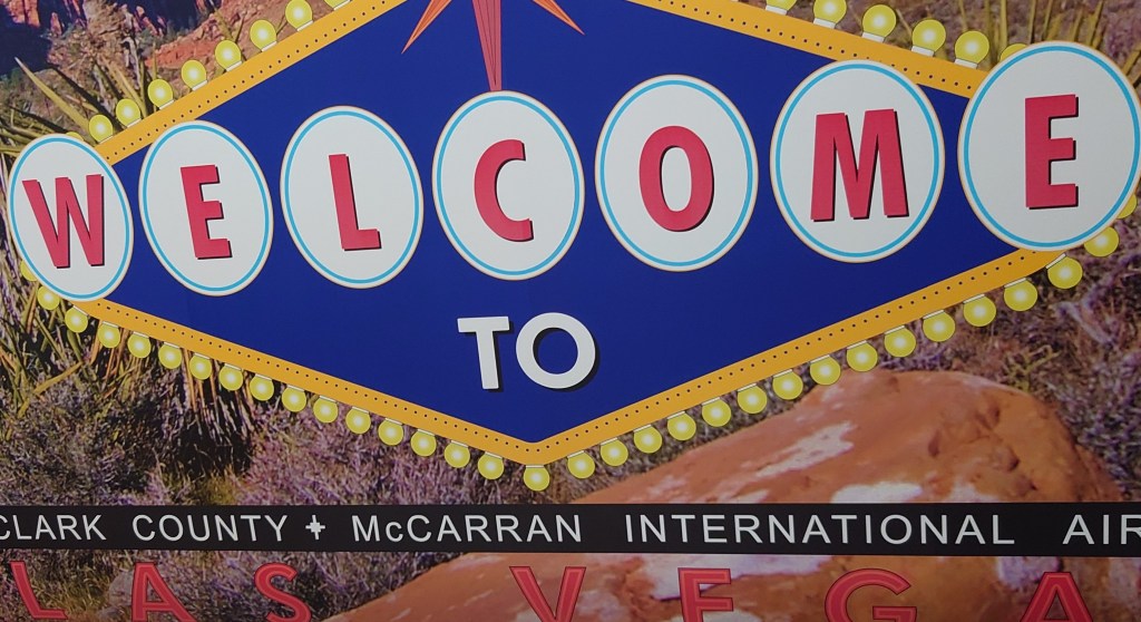 Eindelijk komt Las Vegas in zicht. We landen uiteindelijk 2 uur later dan de oorspronkelijke aankomsttijd. We zijn als een van de eersten uit het vliegtuig en gaan op weg naar Immigrations. Ook hier hebben we versnelde grenspassage, dus voor ons geen rijen meer. We gaan voor de machines staan, er wordt een foto gemaakt van onze charmante verschijningen en we kunnen door naar de Immigrations officer.