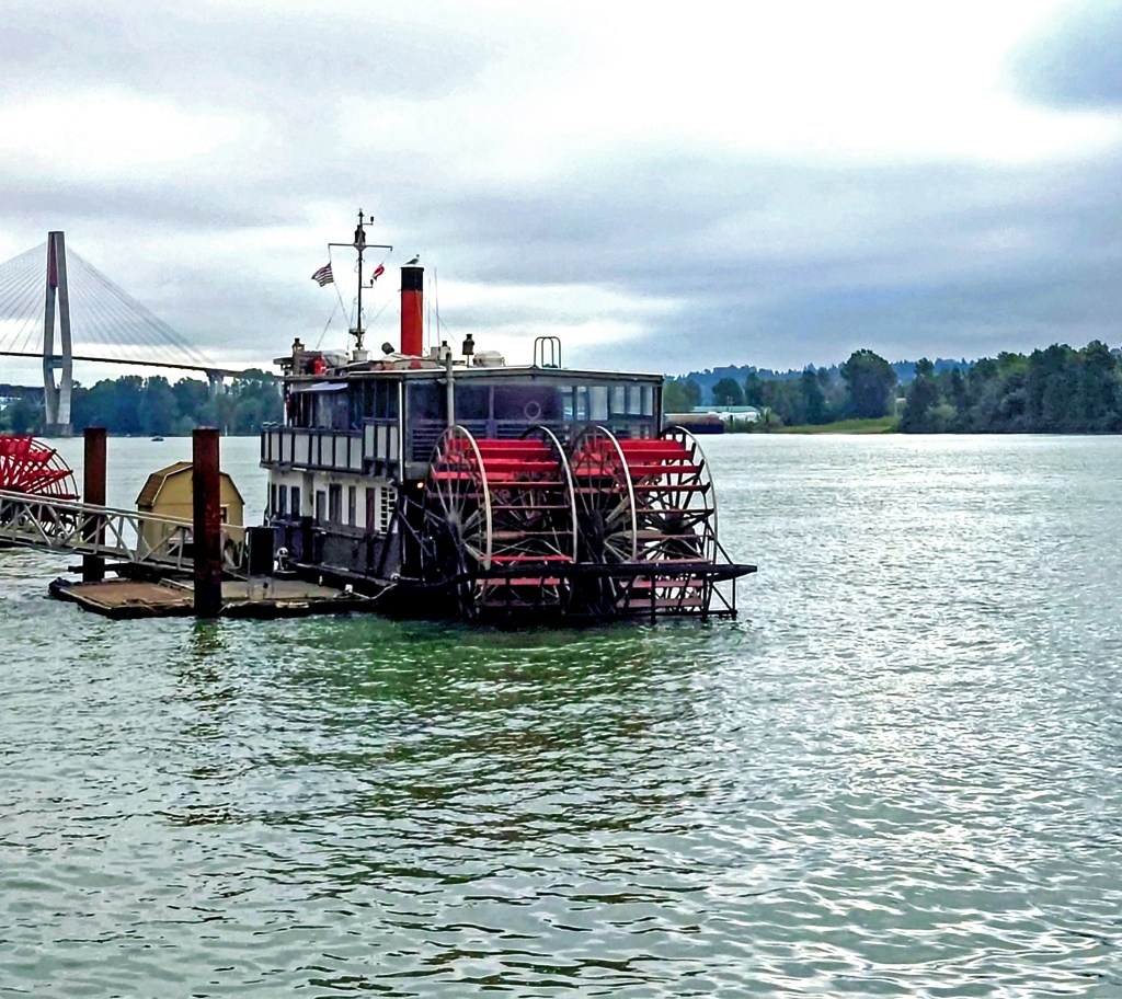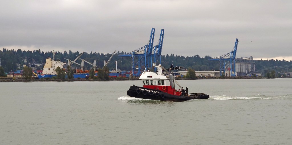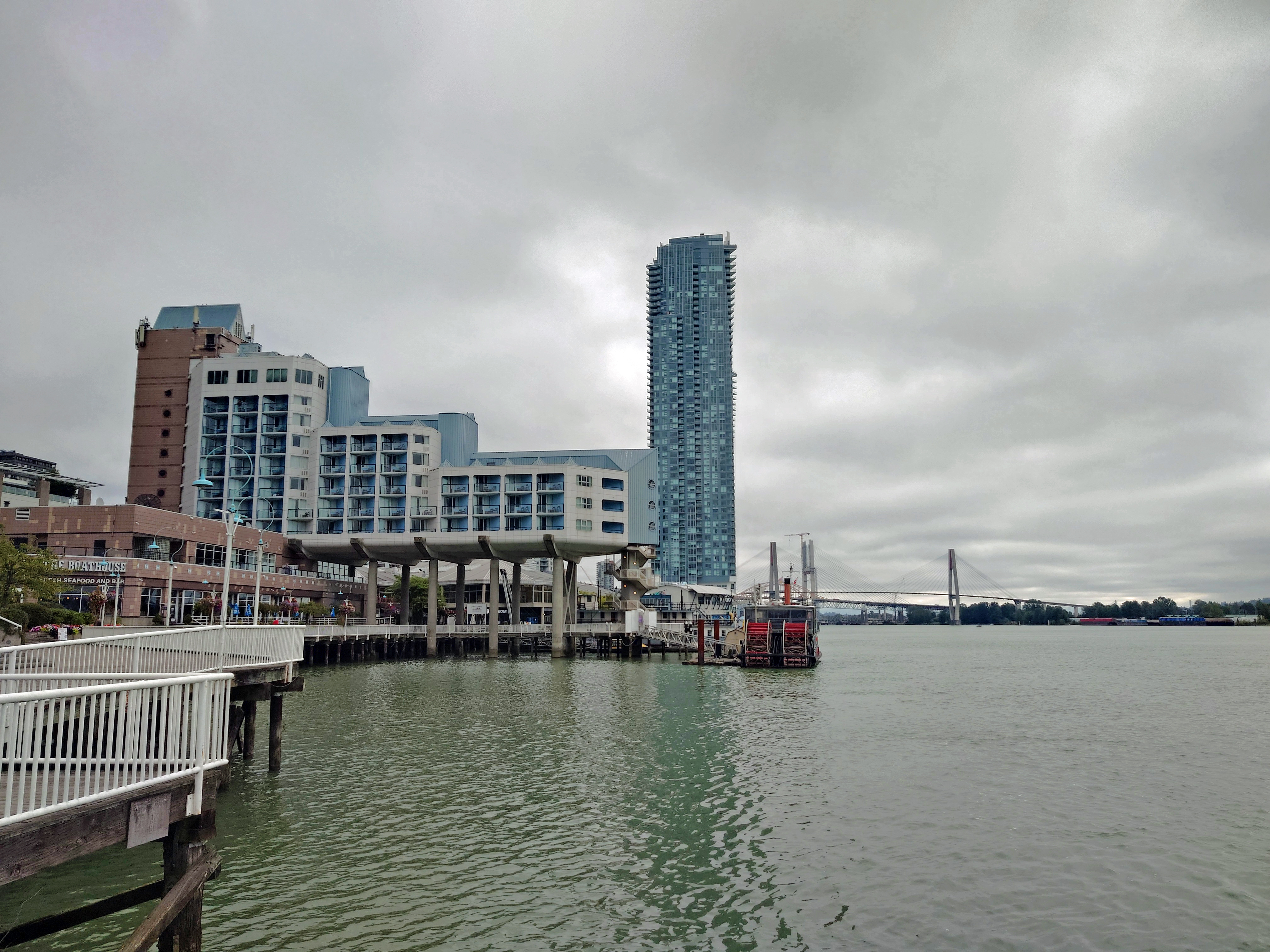 Als we klaar zijn, hebben we nog geen zin om terug naar de hotelkamer te gaan. Het is nog te vroeg om al op pad te gaan. Dus lopen we een stukje de boardwalk op. Het is interessant om te zien dat aan de overkant allerlei houtzagerijen liggen. In Canada, in ieder geval het westen, zie je veel boomstammen in het water liggen. Die worden daar geprepareerd.