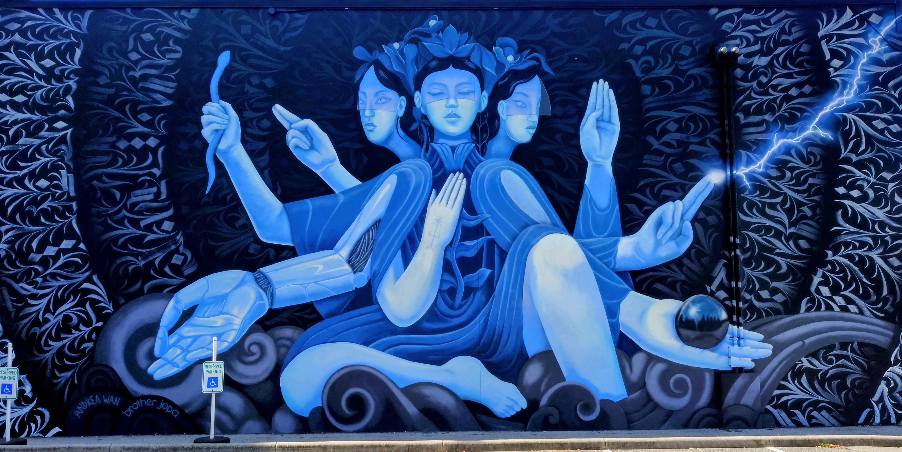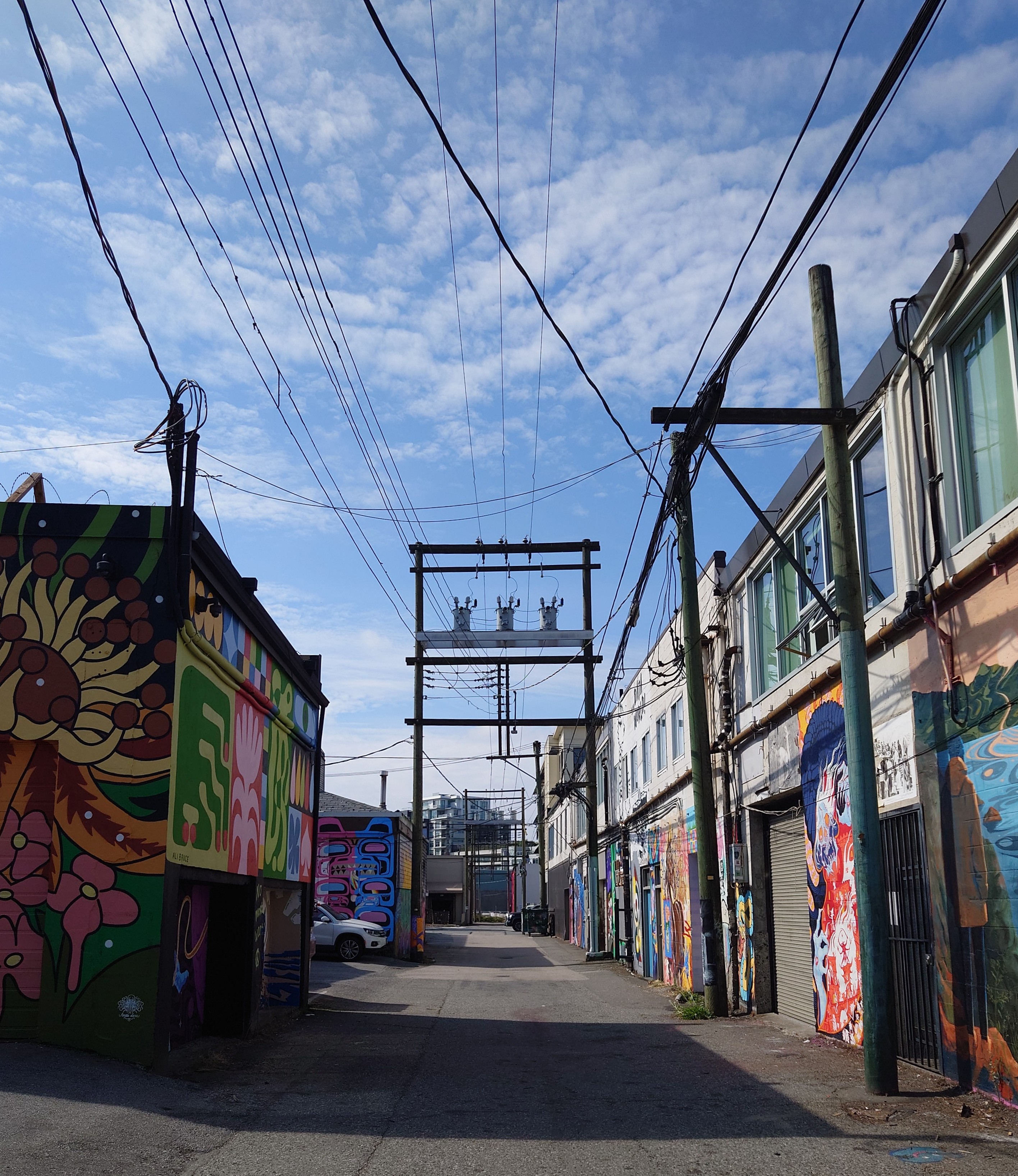 Terug bij de auto lopen we nog even de steeg bij de parkeerplaats in. Het ziet er niet uit, maar er zijn een aantal muurschilderingen aangebracht, die wel de moeite waard zijn.
