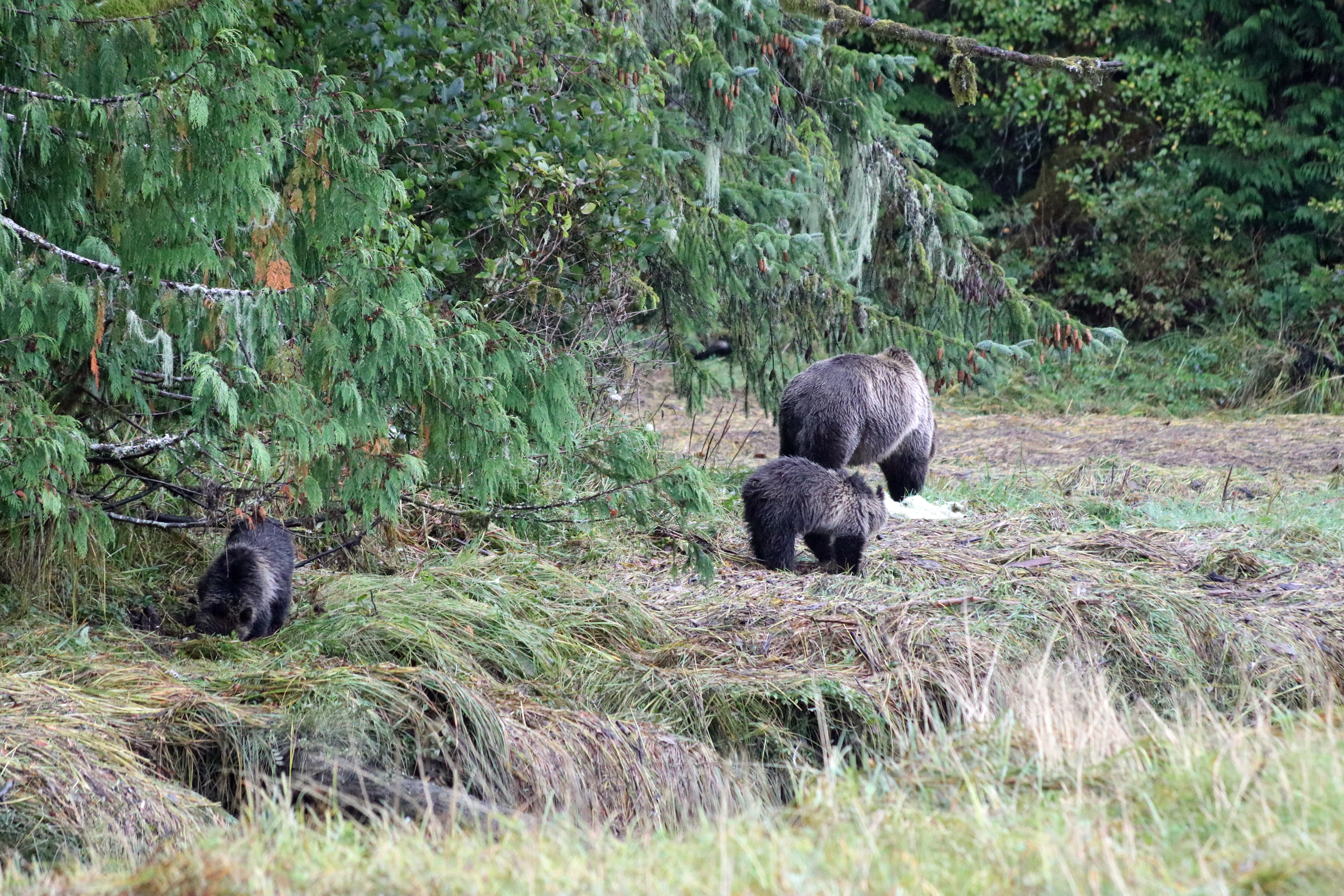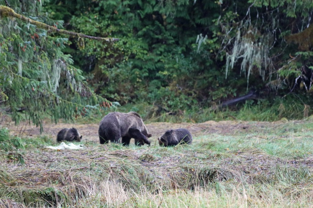 We stappen over en gaan het kleine gebied in. Zodra we dichterbij komen, zien we al 2 grizzly beren, Lenore en Lilian (de beren krijgen namen), die allebei 2 cubs bij zich hebben. Ze zijn een eindje van elkaar aan het grazen en aan het zoeken en graven naar iets in de grond. Dat gaat ze makkelijk af met de klauwen, want ze grazen in een marsh.
