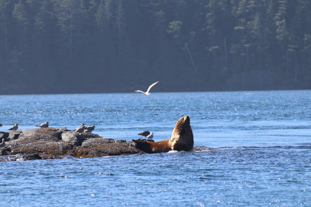 En gelukkig blijft het feest. We zien een enorme zeeleeuw liggen op een rots! En die ligt echt te poseren. Na een tijdje besluit hij genoeg te hebben van alle aandacht en gaat hij het water in. Daarna zien we orca’s, meer humpback walvissen en nog weer een school orca’s. Het kan niet op vandaag. Want andere dieren die we hebben gezien, zijn zeehonden en zeeotters. Het kan niet op!