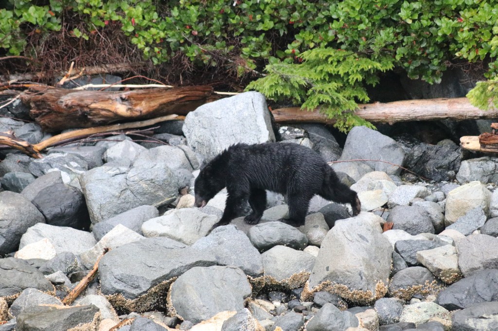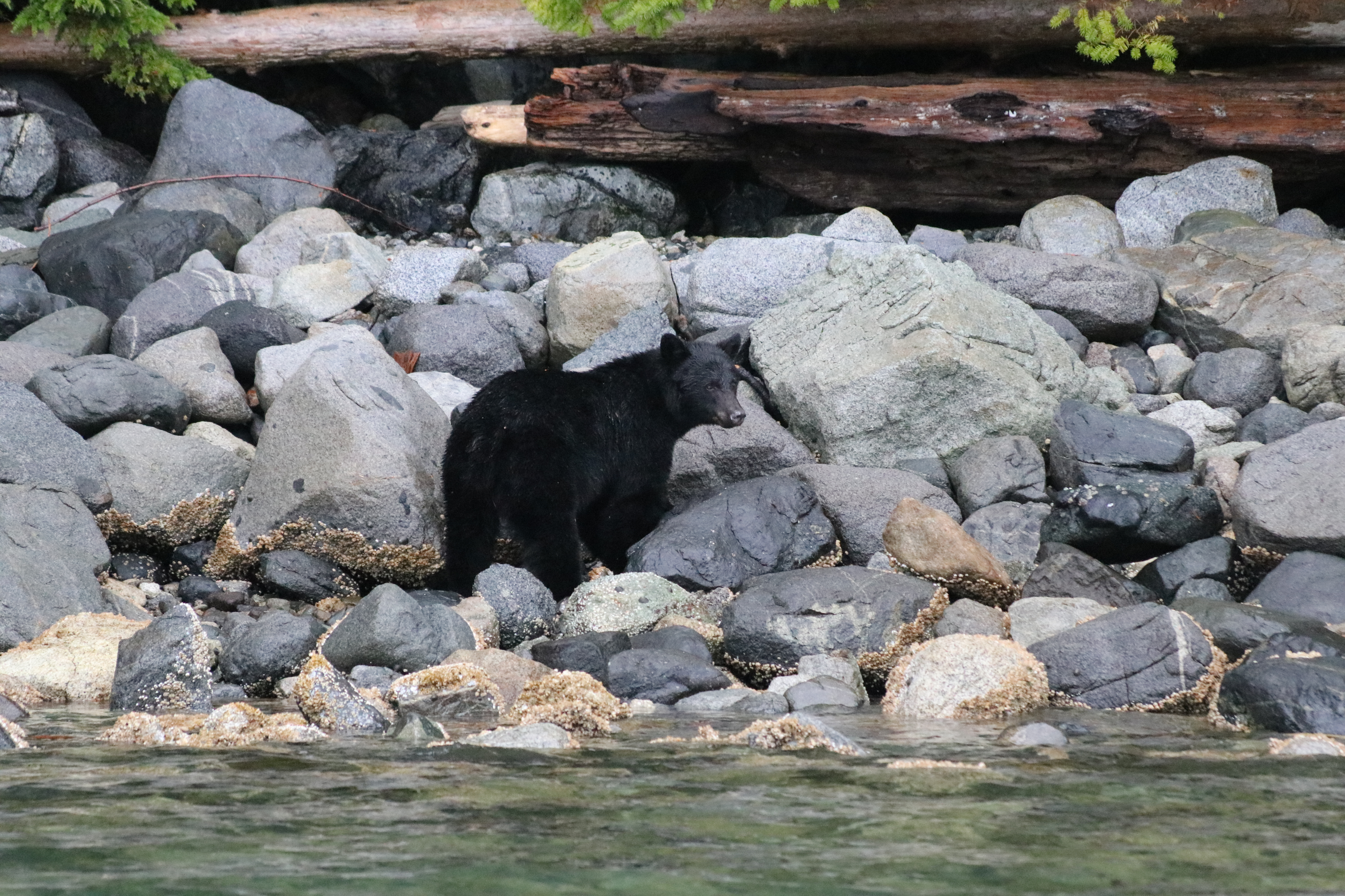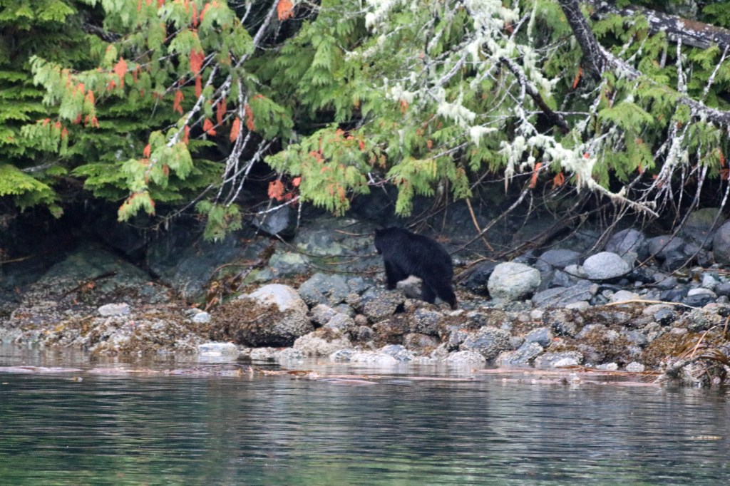Voor mijn gevoel zijn we pas net het haventje uit als er gas wordt teruggenomen en de verrekijkers worden gepakt. Ja hoor, de eerste beer is een feit. Een zwarte beer, welteverstaan.