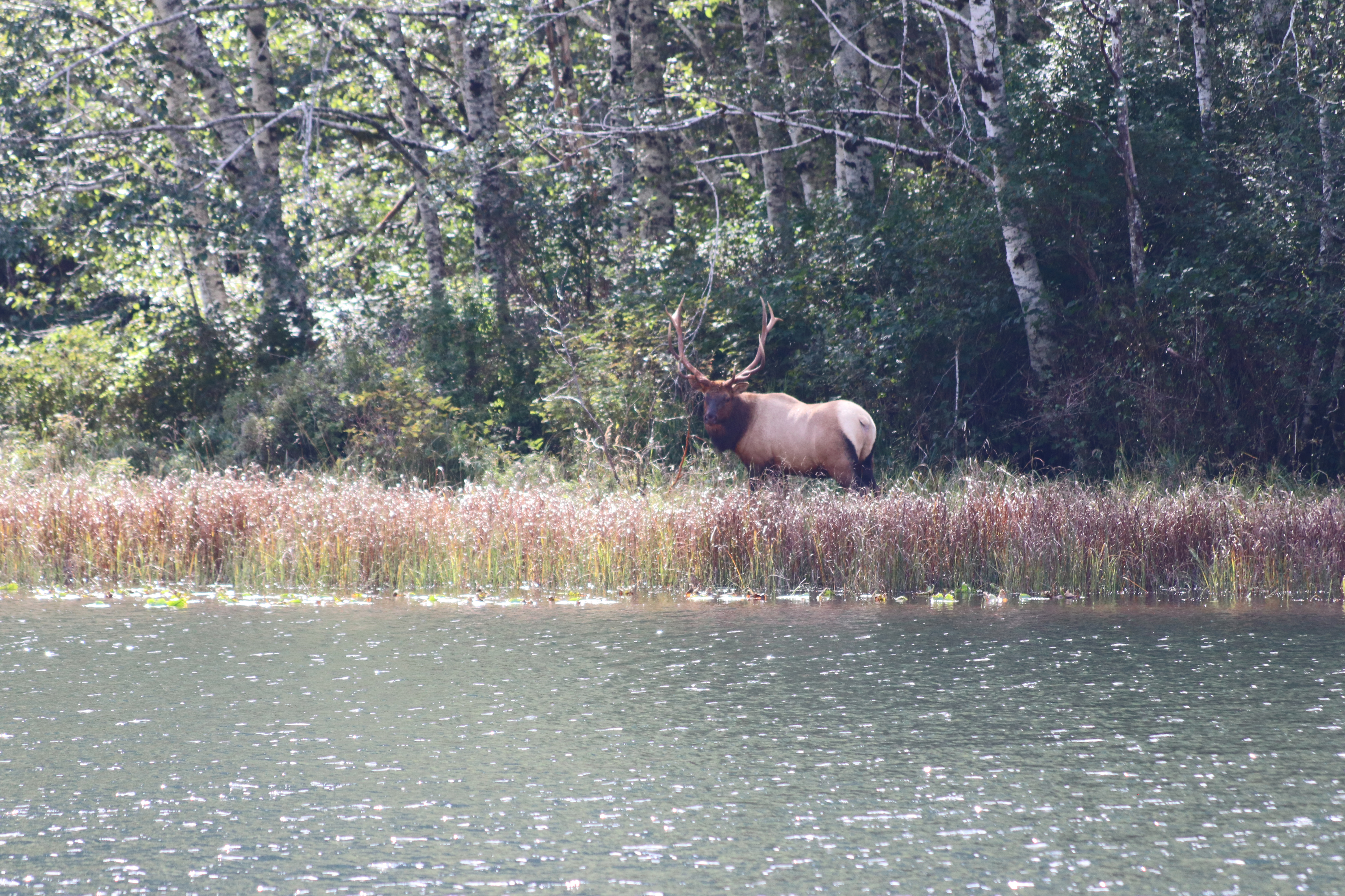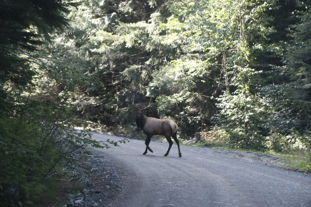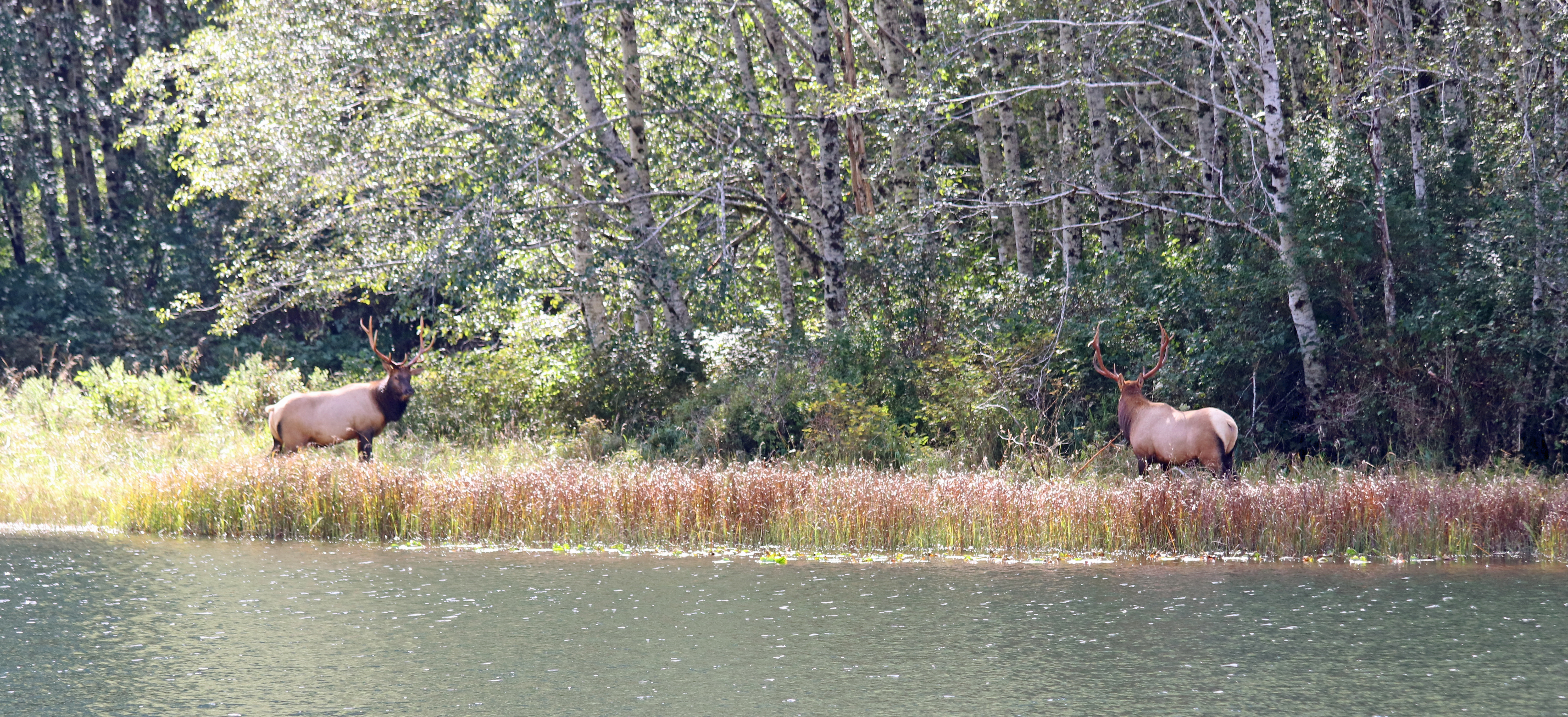 We besluiten om eerst naar Tahsis te rijden en op de terugweg de stops aan te doen. Het valt ons op dat we vrijwel nergens bordjes zien staan. Als we bijna bij Tahsis zijn, zien we aan de overkant van Berry Lake 2 wapiti herten staan. Zij bekijken ons, wij bekijken hen. Monique maakt snel wat foto’s en dan rijden we weer door.