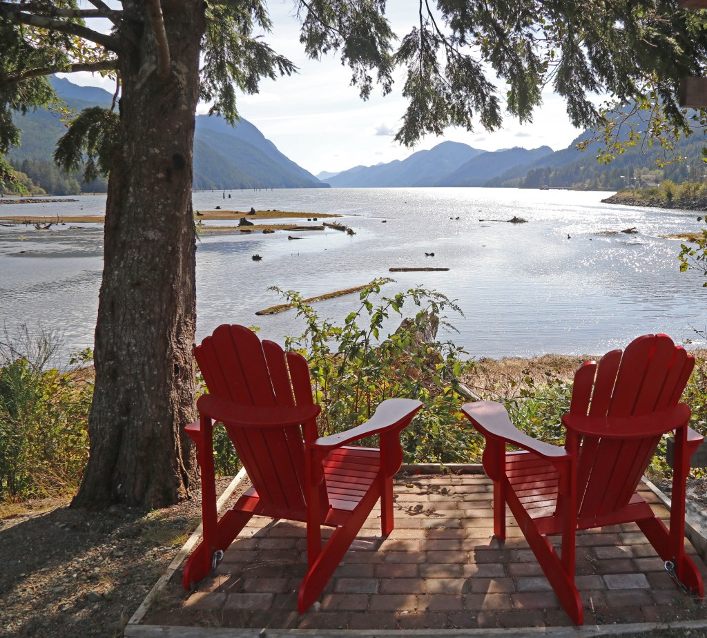 Bij Tahsis zien we dat het inderdaad een kleine gemeenschap is, gebouwd rond een deel van het meer. Het stelt niet veel voor en als we even hebben rondgereden, stoppen we bij 2 rode adirondeck stoelen, de zogenoemde red chairs. Op verschillende plekken in British Columbia heeft de overheid red chairs neergezet. Bedoeld om te genieten van al het moois dat je om je heen ziet.