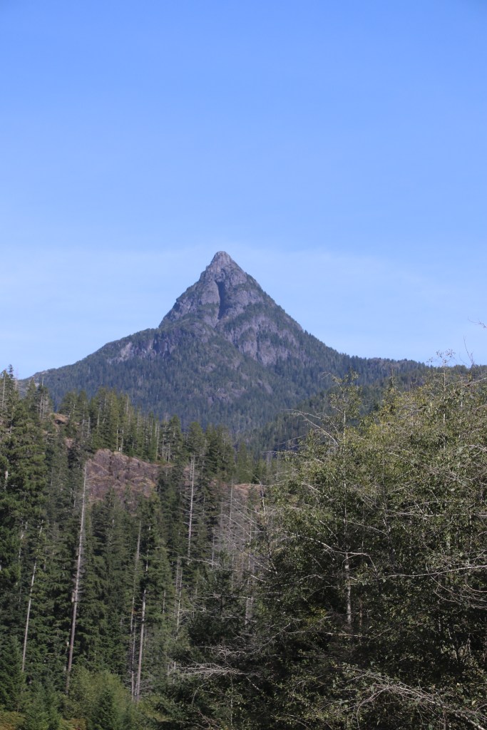 Nadat we ons broodje op hebben gepeuzeld en wat foto’s hebben genomen, gaan we weer op pad. We rijden dezelfde weg terug, stoppen we bij de 3 Sister Falls, die helaas niet veel voorstellen en slecht te fotograferen zijn, bij Painted Rock wat door highschoolers wordt beschilderd als ze geslaagd zijn (hier is niet veel meer van te zien) en we stoppen nog bij een meer. Ook stoppen we bij de Konuma Peak wat lijkt op een naald waar je een draad door heen kan doen. Andere stops missen we omdat ze niet worden aangegeven. Een beetje jammer dus. Wat we wel zien, zijn verschillende (wapiti) herten en bambi. Een aantal laten zich fotograferen, anderen zijn snel verdwenen.