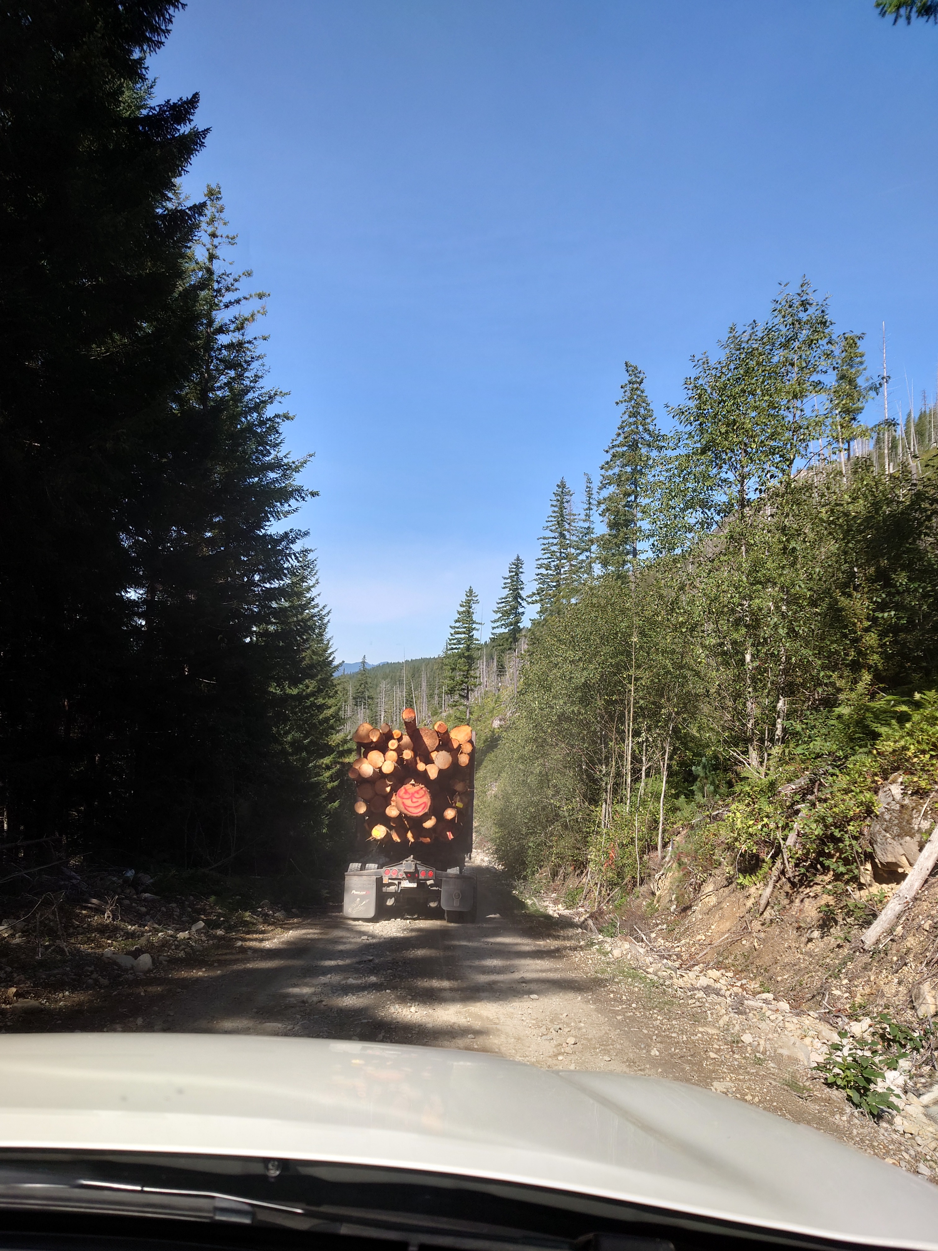 We rijden gestaag door en slaan uiteindelijk af bij een houtzagerij. Hier stijgt de weg 18% en dat gaat de auto makkelijk af. Maar op het moment dat een logtruck (een truck vol met boomstammen) naar beneden komt rijden, en wij uit de weg moeten, zegt Monique dat we verkeerd zitten. Ik rij nog een stukje door, maar draai dan om.