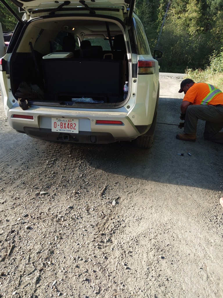 Als we bijna bij Highway 19 zijn, gaat het mis. Ik krijg een melding dat de druk van een van de banden niet goed is. Nu krijg ik die melding thuis ook wel, dus ik rij het laatste stukje door tot we bijna bij BC-19 zijn. Hier stap ik uit en zie dat we inderdaad een lekke band hebben. Ik check het bereik op mijn telefoon en zie dat dat nihil is. Dat is balen, want we zijn op de hele route een handvol auto’s tegengekomen.
