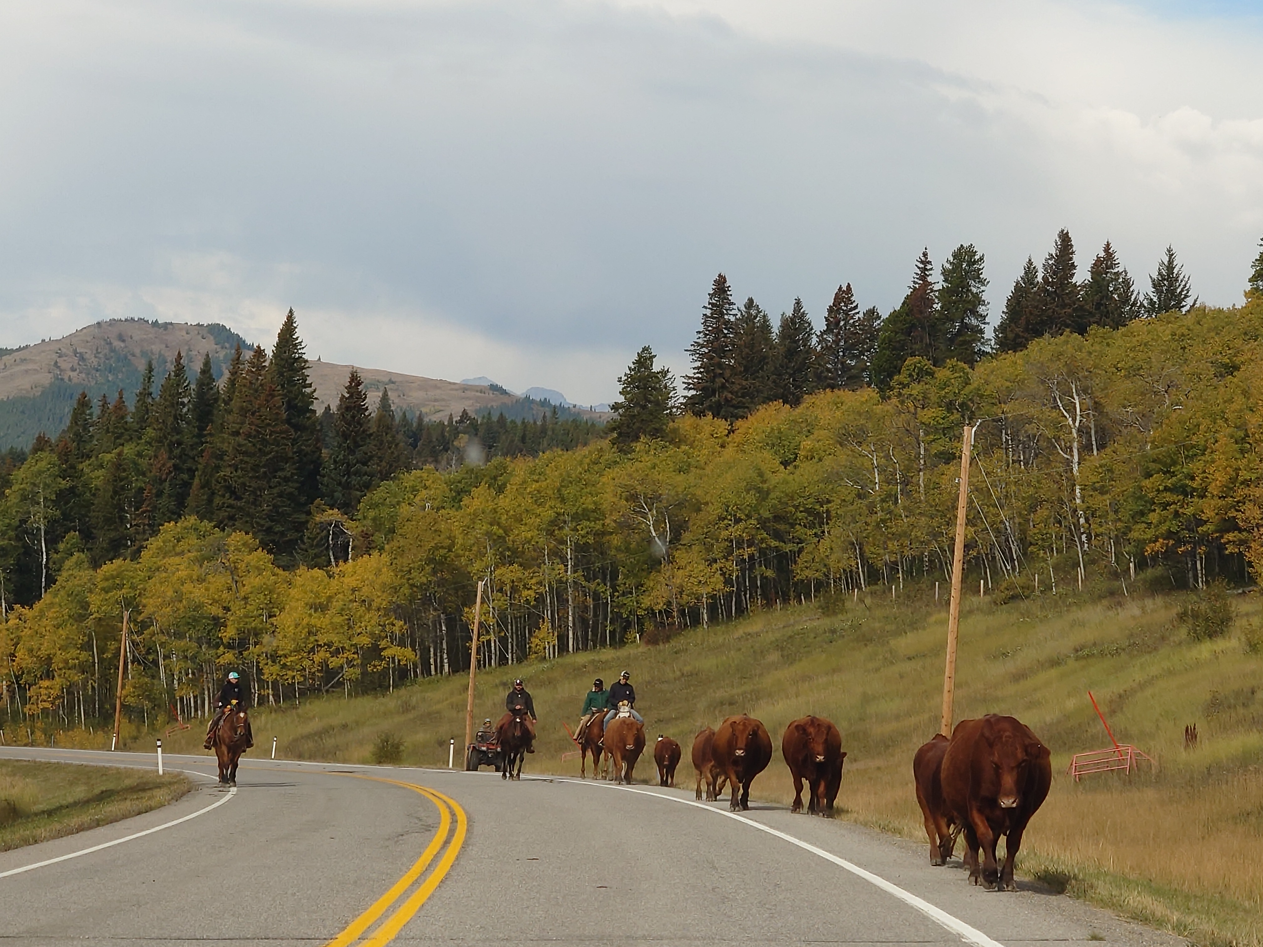 Ineens komt een hele kudde op ons af. Die lopen door de berm, maar ook midden op de weg. Er zijn een aantal mensen op paarden en quads bij, maar de koeien lijken precies te weten waar ze naar toe moeten.