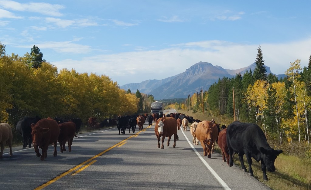Er zijn genoeg viewpoints, maar niets wat ons echt kan bekoren. Wel is duidelijk dat dit gebied een zogeheten ‘Open Range’ is. Regelmatig zien we koeien langs de weg grazen.
