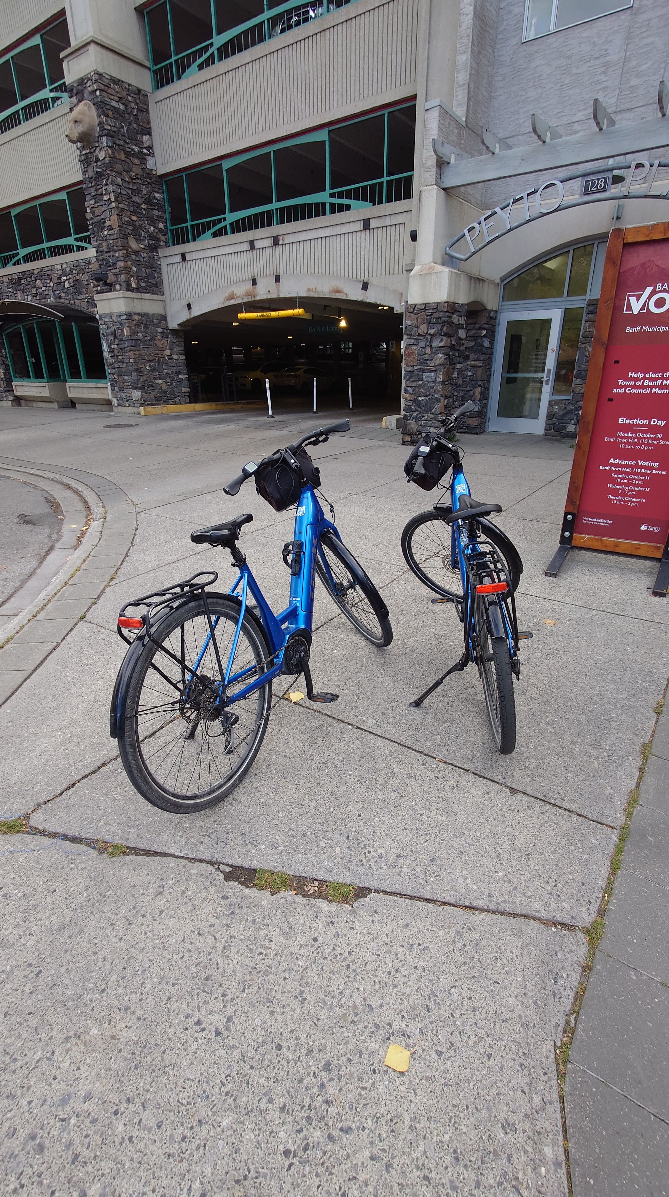 We kletsen een tijdje en dan nemen we weer afscheid. Voor Monique en mij wordt het tijd om onze gereserveerde fietsen op te halen. Dat doen we bij Banff Cycle. We krijgen helmen (hier verplicht) en dan neemt een van de medewerkers ons mee naar buiten. Het blijkt dat hij ooit in Alkmaar is geweest. Hij verbaasde zich erover dat iedereen in Nederland zonder helm fietst. We vertellen dat het nu een hot item is.