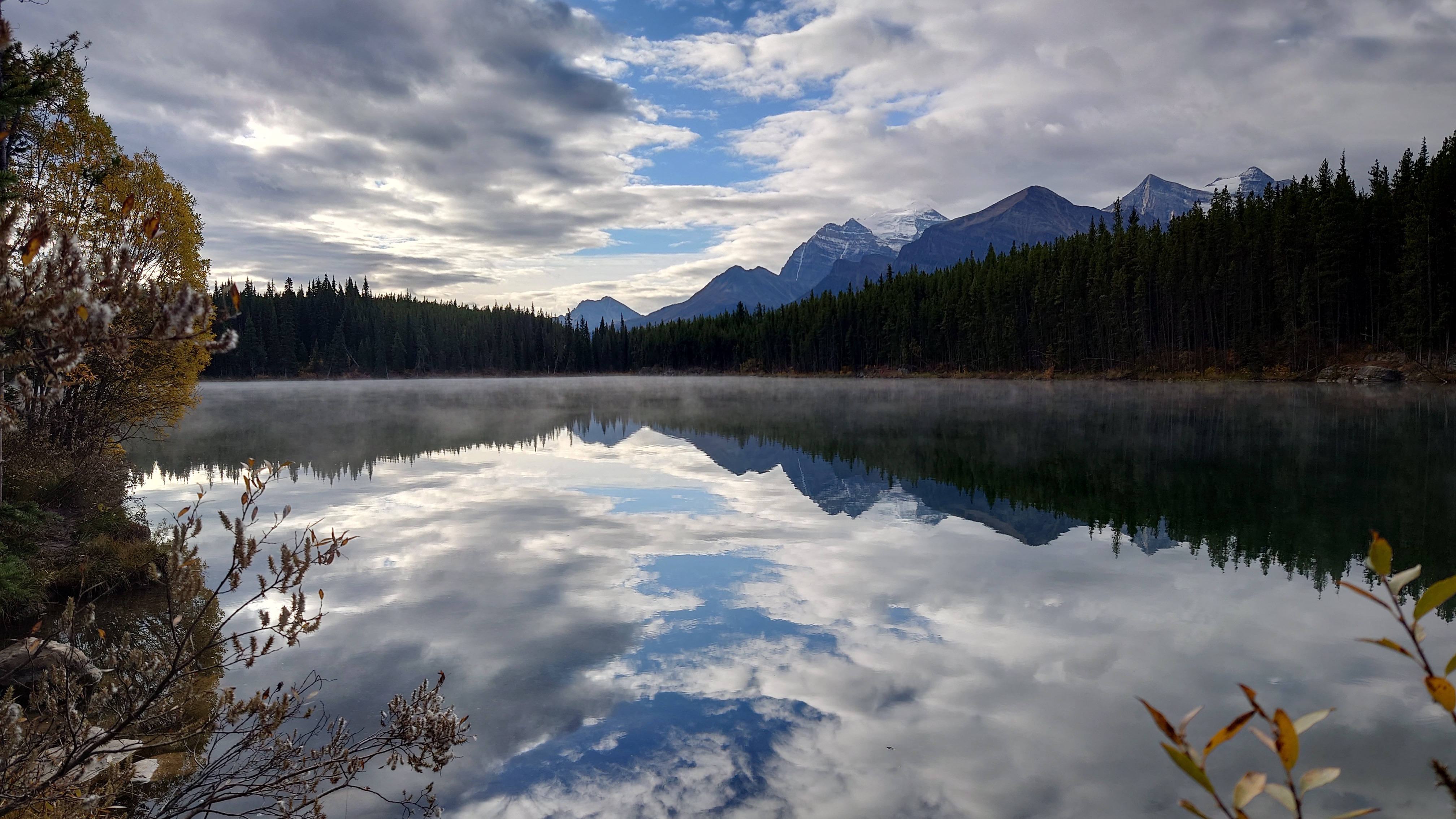 We rijden door en meteen bij het eerste viewpoint, Hector Lake, stoppen we meteen. We parkeren de auto en lopen naar de waterkant. Het is niet zo’n groot meer, maar met de kleuren en de damp die van het water komt, ziet het er bijzonder uit.