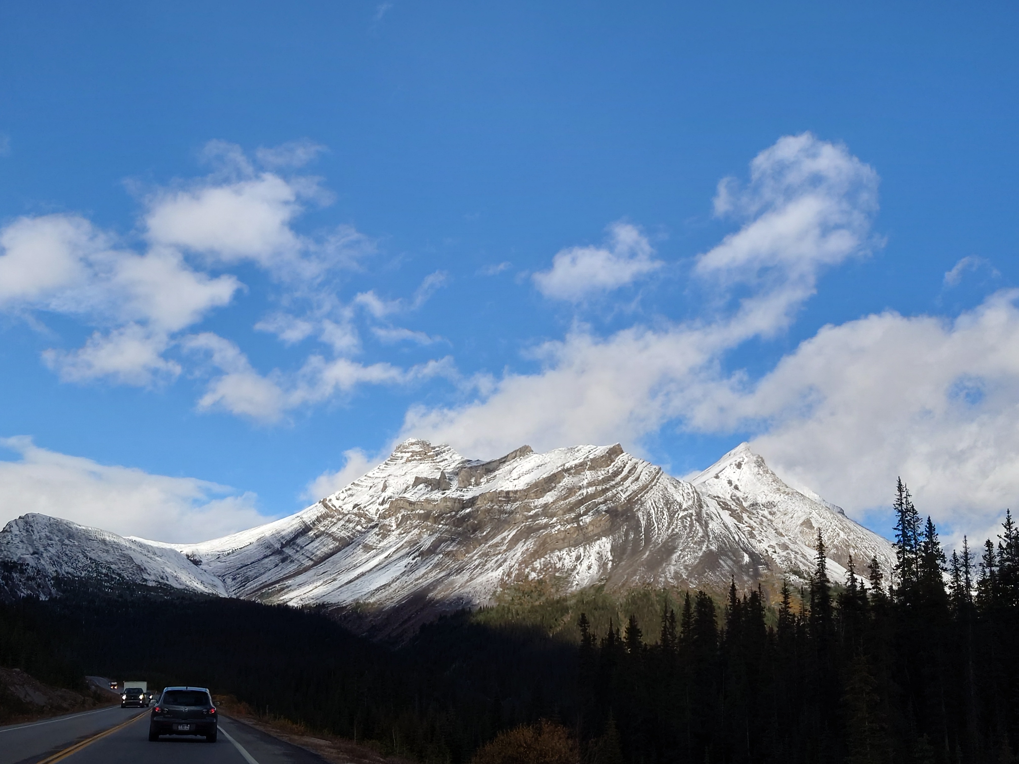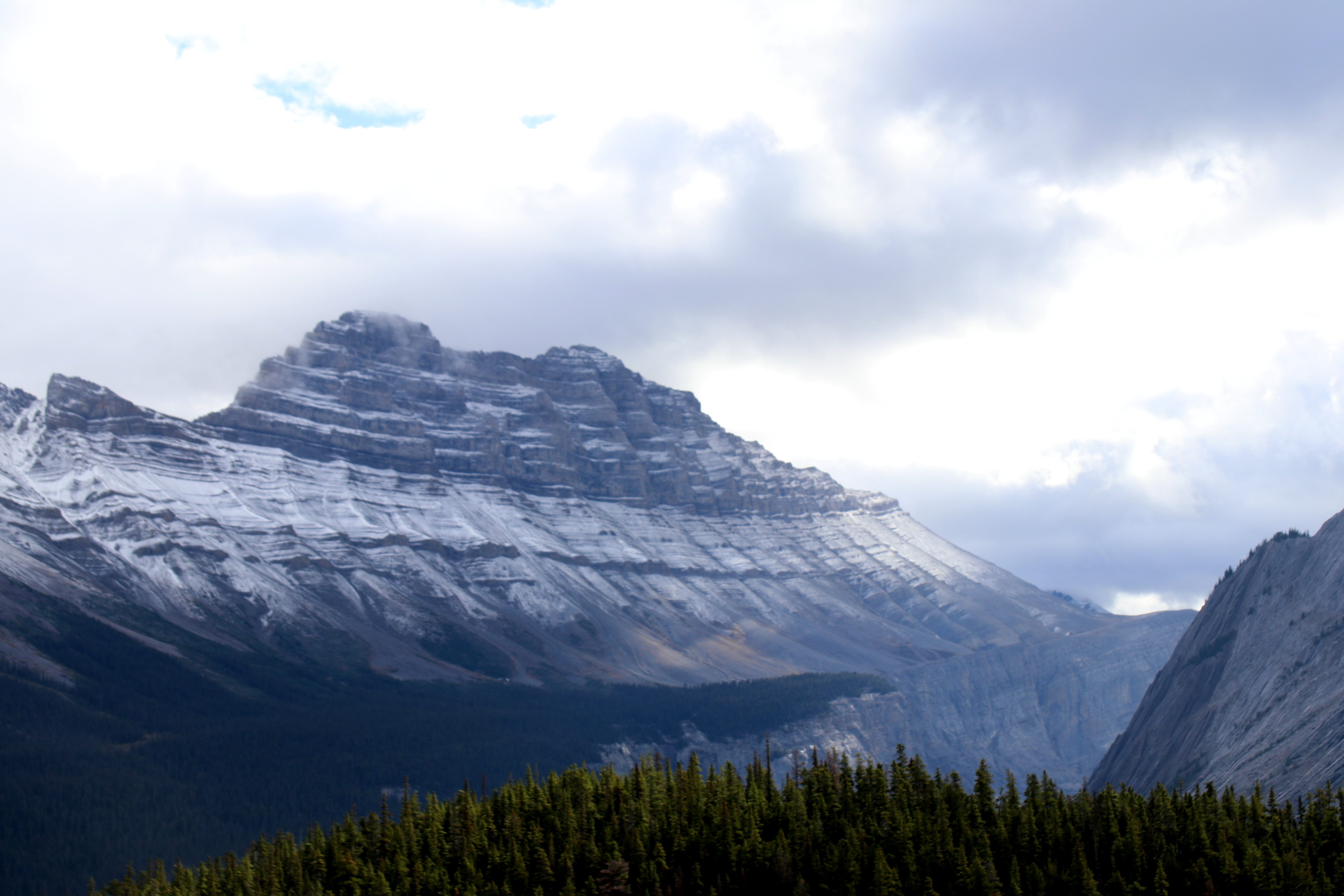 Daarna rijden door en voordat we het weten, zien we de eerste bergen met besneeuwde toppen. Het is duidelijk dat het hier vannacht heeft gesneeuwd. Ook bij Lake Louise werd sneeuw verwacht.
