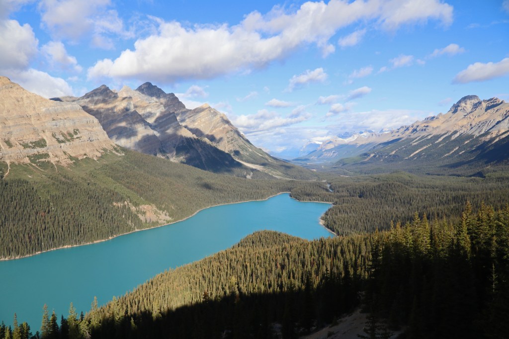 Al snel komen we bij Peyto Lake. Dit meer is kenmerkend door de enorm blauwe kleur van het water. Het is schitterend gelegen, maar ook een punt waar busladingen met toeristen worden gedropt. Natuurlijk stoppen wij hier ook. Het is te mooi om over te slaan.