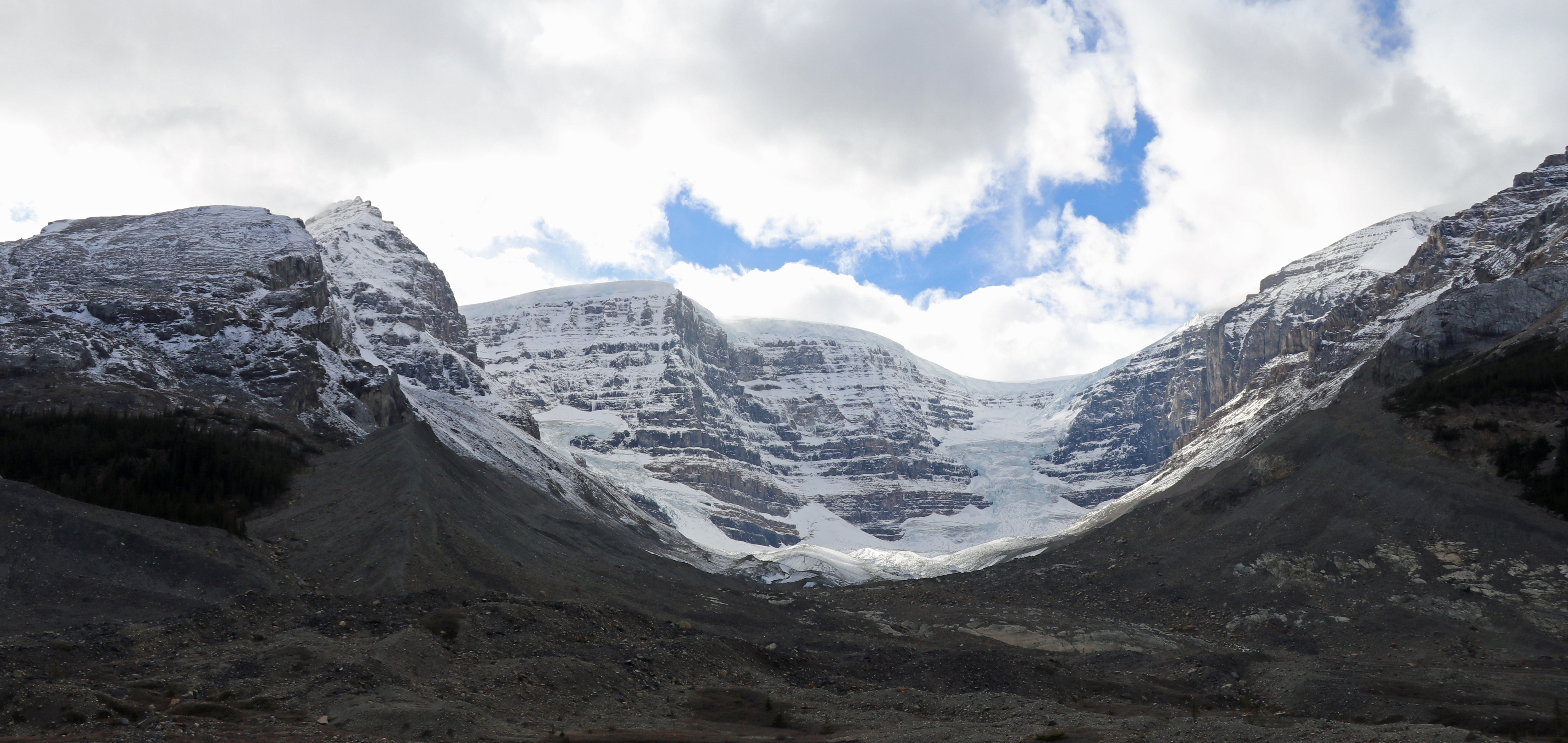 Als we de Athabasca Glacier bereiken, schrikken we net als in 2008. Toen we hier voor de eerste keer kwamen, konden we vanaf de weg op de gletsjer stappen. Dat hebben we natuurlijk ook gedaan. Ook zijn we toen de tour gedaan, waarbij we met een bus naar de overkant van de weg werden gebracht. Daar stonden de bussen met rupsbanden te wachten. In 2008 was er van de hele gletsjer langs de weg niets meer te zien. Geloof wat je wilt qua klimaatveranderingen, maar het is duidelijk dat dit soort natuurverschijnselen langzaamaan verdwijnen.