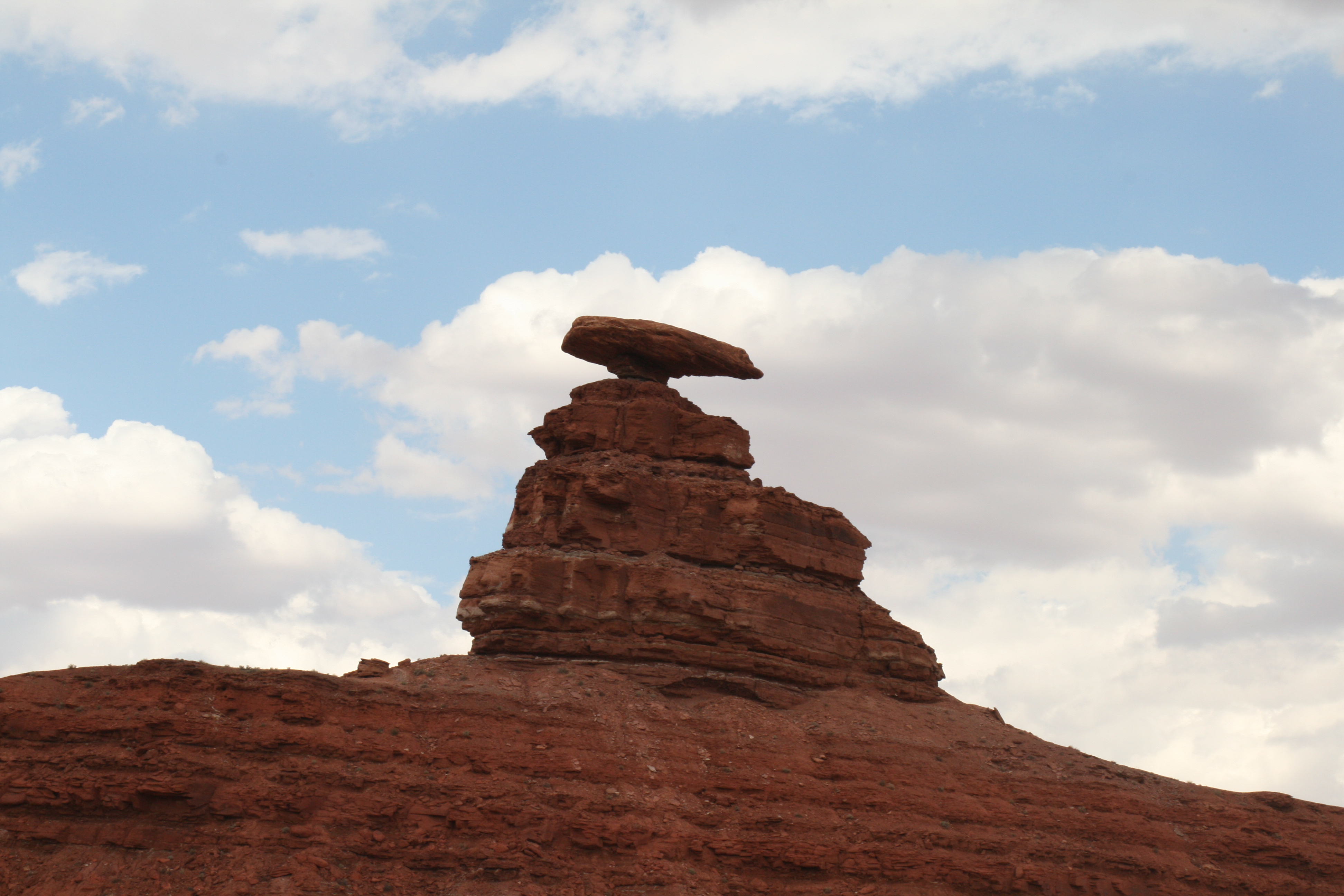 Na deze pret gaan we op weg naar Mexican Hat. Ook hier zijn we weer in onze nopjes als we zien dat ook hier een dirtroad naar toe gaat. We doen het iets rustiger aan, want er zit een stationwagen voor ons. Mexican Hat is ook weer een rotsformatie en altijd grappig om te zien.