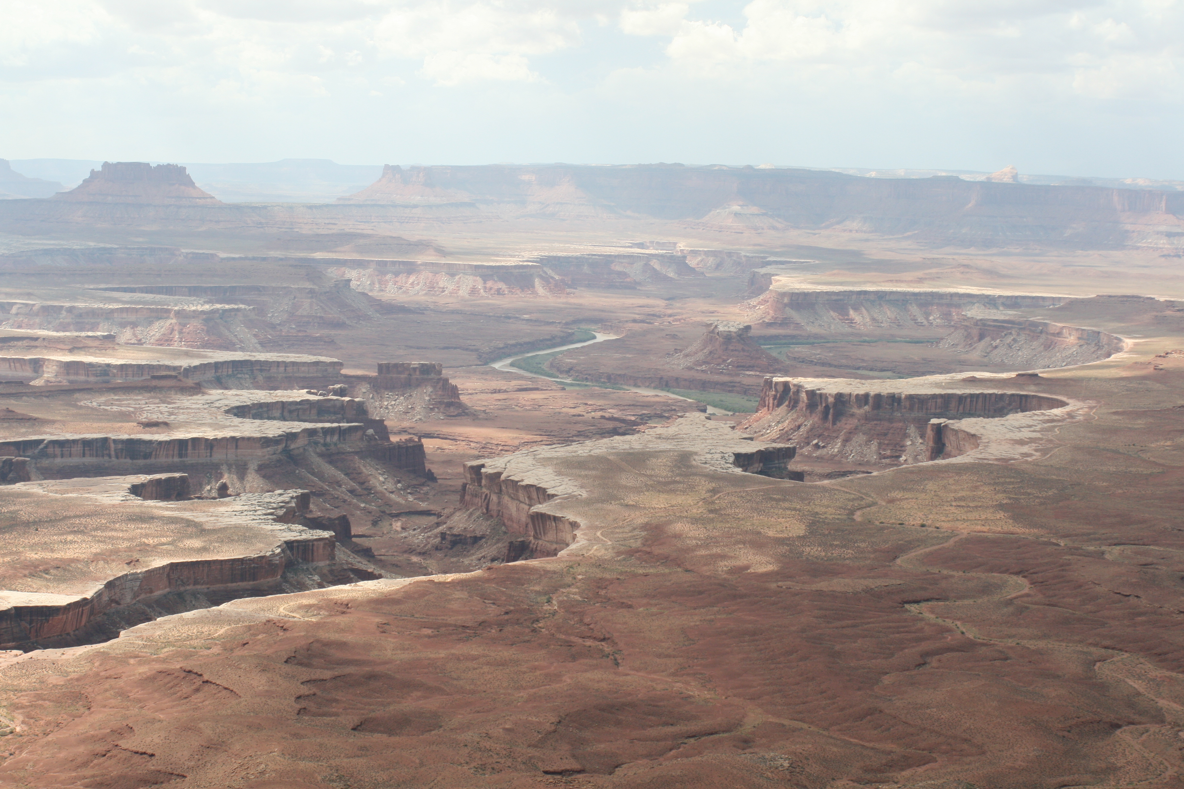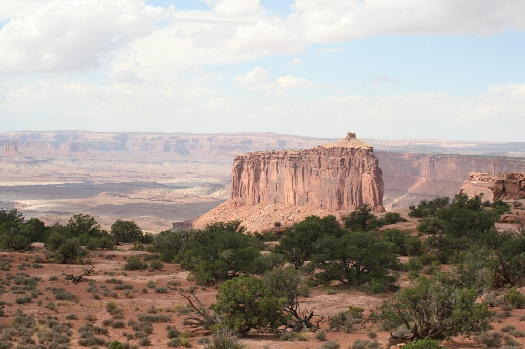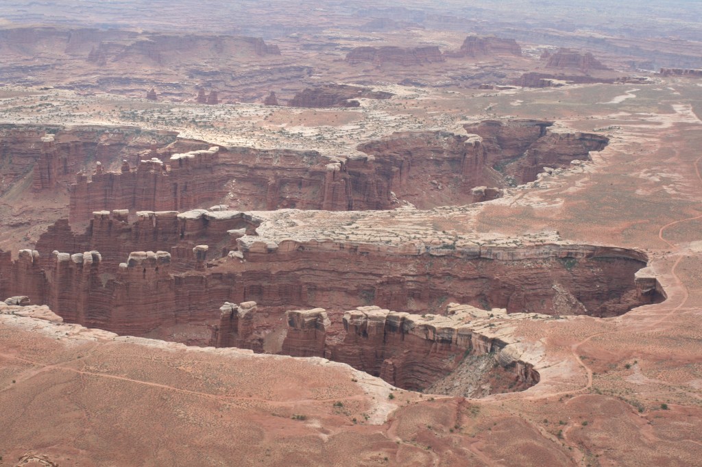 We eten weer een lekker ontbijtje bij Denny’s en verwonderen ons over de enorme hoeveelheden die andere bestellen. Daarna gaan we op weg naar Canyonlands NP. We rijden direct door naar het Visitor Center. Daar raden ze ons niet af om de trail te gaan rijden, maar ze roepen ook niet “Go for it!”. Er wordt nog steeds regen verwacht en als de Amerikanen één ding beter kunnen dan Nederlanders, dan is het wel het weer voorspellen. Nu is de trail nog goed te rijden, maar dat kan veranderen zodra de eerste druppels vallen. De weg verandert dan al snel in een modderpoel en de beslissing is dus snel genomen. We doen het niet. De verrassing van de dag is dat ook wij verstandig kunnen zijn!